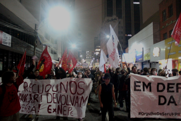 Em Curitiba, mais de 200 estudantes da UFPR, UTFPR, UNESPAR, CEEP, professores e trabalhadores, tomaram as ruas do centro em uma vitoriosa manifestação contra o roubo de verbas da educação pública! Durante a concentração marcada as 18h no pátio da Reitoria da UFPR, foram feitas falas da ExNEPE, do Comitê de Apoio do Jornal A Nova Democracia e de estudantes da medicina. Terminadas as falas, os estudantes saíram em marcha pelas principais ruas da capital, passando pela Praça Santos Andrade e terminando a manifestação na UTFPR.