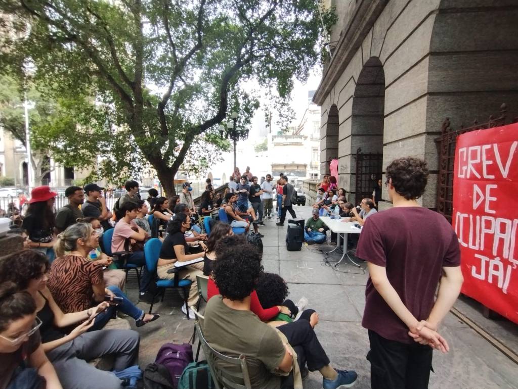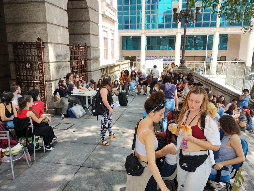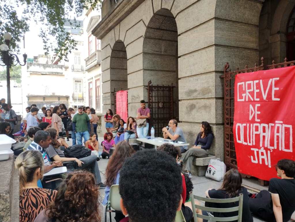 No retorno pro IFCS, apesar dos esforços de elementos para implodir, aprovamos o estatuto definindo a independência e combatividade como guia, as comissões de trabalho, a primeira noite de ocupação e a assembléia da manhã seguinte para decidirmoss com mais estudantes o rumo da ocupação. Entendendo que a ocupação já começara desde a paralisação do dia 18/10. A pauta da ocupação era pela recomposição orçamentária, pela troca da fiação do IFCS (em risco de pegar fogo) e pelo pagamento e garantia de alimentação imediato dos trabalhadores terceirizados. Foram eles mesmos que procuraram os estudantes para denunciar que todos os trabalhadores terceirizados de todos os campus da UFRJ estavam há 20 dias sem receber. Na noite, organizaram a janta e a paralisação do primeiro horário do dia seguinte. Decidiram pela desocupação na assembléia e defenderam um ato no IFCS pelo pagamento imediato dos terceirizados. Na assembléia, a UNE defendeu o “preparar para preparar”. Quando perderam o controle, partiram para a criminalização do movimento estudantil acusando de “baderna” e “vandalismo” a ocupação e filmando a cara dos estudantes que ocuparam os ameaçando levar para a delegacia. Chegaram a colocar um elemento petista para tacar cadeiras do piquete em duas estudantes mulheres porque “não poderíamos nos mobilizar agora, só depois que Lula for eleito”. Na assembléia, a UNE foi obrigada novamente a se curvar aos interesses dos estudantes e aprovar a ocupação, mas sem data.