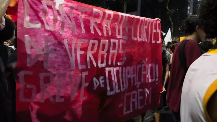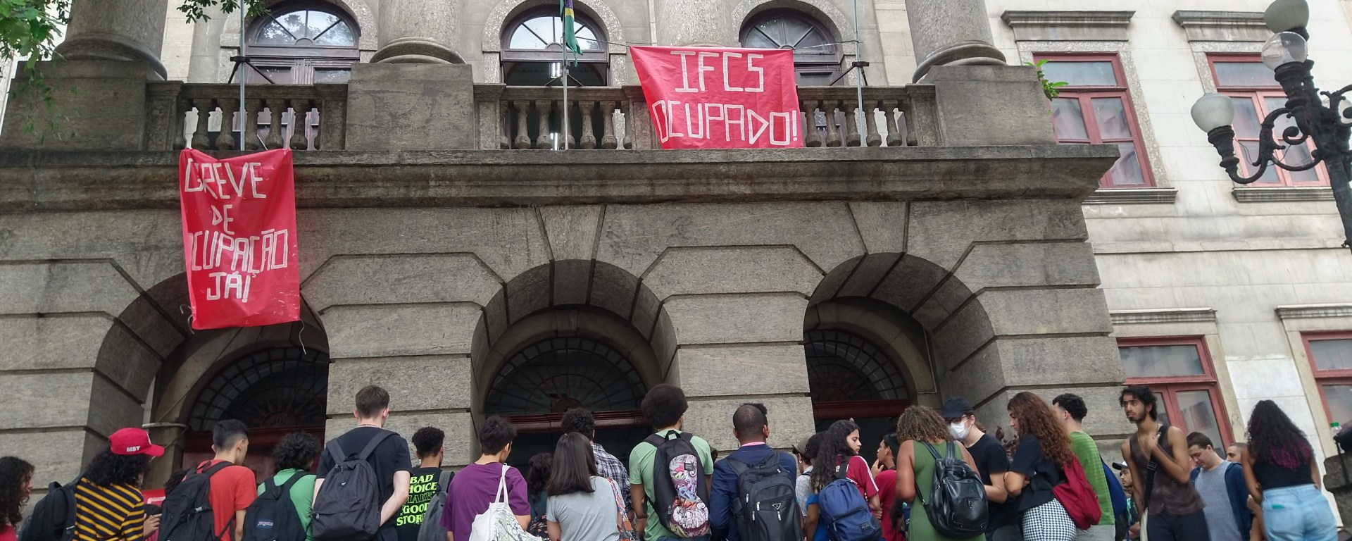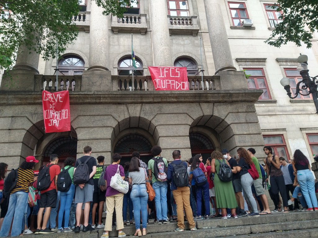 Respeitando a decisão da assembléia e não deixando acontecer a mesa dos oportunistas da UNE e principalmente DCE (correnteza, juntos, ujc e ujs) que além de não fazerem o repasse da assembléia, esconderam a ata e ainda quiseram montar uma mesa com o Leo Péricles e outros ex candidatos não eleitos em cima da pauta dos cortes de verbas. Pediram para unificar as mesas pois elas “tinham o mesmo objetivo”, porém não aceitaram as condições para que os professores do IFCS participassem sem os candidatos. Tentaram implodir a mesa uma primeira vez. Pra tristeza deles, não conseguiram fazer a mesa com os candidatos na escadaria, pois os estudantes não concordaram que a paralisação virasse comício e por isso colocaram um carro de som para tocar no meio da fala do professor de Antropologia. Tentavam fazer recuar os estudantes e professores que queriam ocupar a entrada do prédio e sem sucesso, começaram a se organizar do lado de fora pro ato-comício. O bloco dos estudantes do IFCS foi junto com o Centro Acadêmico de Música da UFRJ defendendo “contra os cortes de verbas: greve de ocupação”. Esses estudantes convocaram todos no ato para a assembléia de ocupação.