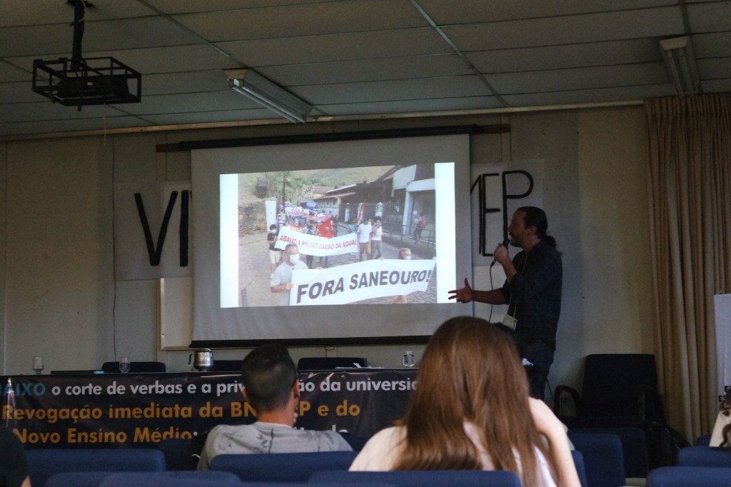 Encerrada a mesa de abertura, deu-se início a primeira mesa com tema “A luta contra a privatização da universidade pública e da água de Ouro Preto”, que contou com a participação da professora Lívia Damasceno, do professor Marcos Calazans e do companheiro Antônio. A participação da profª. Lívia se deu por um vídeo, impossibilitada de comparecer presencialmente como estava. A professora expôs de forma sucinta mas clara sobre as políticas de privatização da universidade pública como políticas contínuas em diversos governos, de FHC, passando por Lula e Dilma, Temer e atualmente no governo militar. Todas políticas ditadas por órgãos do imperialismo, principalmente ianque, como Banco Mundial e FMI. Após, o companheiro Antônio expôs um histórico das universidades no Brasil, a começar pelo surgimento das primeiras universidades na América Latina, passando o período colonial, pelas lutas do povo brasileiro em sua história, chegando ao século XX, Vargas e os governos posteriores, o regime militar e as lutas estudantis, até chegar nas atuais políticas e apontou o caminho da luta estudantil como o de luta combativa citando as recentes greves de ocupação vanguardeadas pela ExNEPe. Após, veio o professor Marcos Calazans, que trouxe em sua fala um histórico do processo de privatização da água de Ouro Preto e um histórico da luta do povo ouro-pretano organizados pelo CSDP, desde as primeiras atividades do CSDP, as primeiras manifestações, a estratégia de barrar a hidrometração que segurou a cobrança de tarifas pela Saneouro por um ano; iniciadas as cobranças, trouxe fotos e vídeos das grandiosas manifestações que explodiram como rebelião do povo, ocupando no dia 19/10 a prefeitura da cidade e os ataques covardes por parte da guarda civil; logo, as ameaças, calúnias e difamações por parte de vereadores, prefeito e empresa, numa tentativa de criminalizar e deslegitimar a luta e a atuação do professor. A fala do professor foi um dos pontos mais aguardados do evento. As fotos e vídeos, junto do relato trazido emocionou a todos e elevou o ânimo de luta, a confiança no poder da organização do povo. Durante os vídeos que mostravam a população impedindo a instalação de hidrômetros, das manifestações, os presentes aplaudiam e vibravam. Ao fim da fala do professor Marcos, todos exclamaram em alto e bom som: “Fora Saneouro, a água é do povo!” No debate sobre a mesa 1, onde estudantes fizeram denúncias da situação particular de suas universidades, e exaltando o caminho da luta combativa.