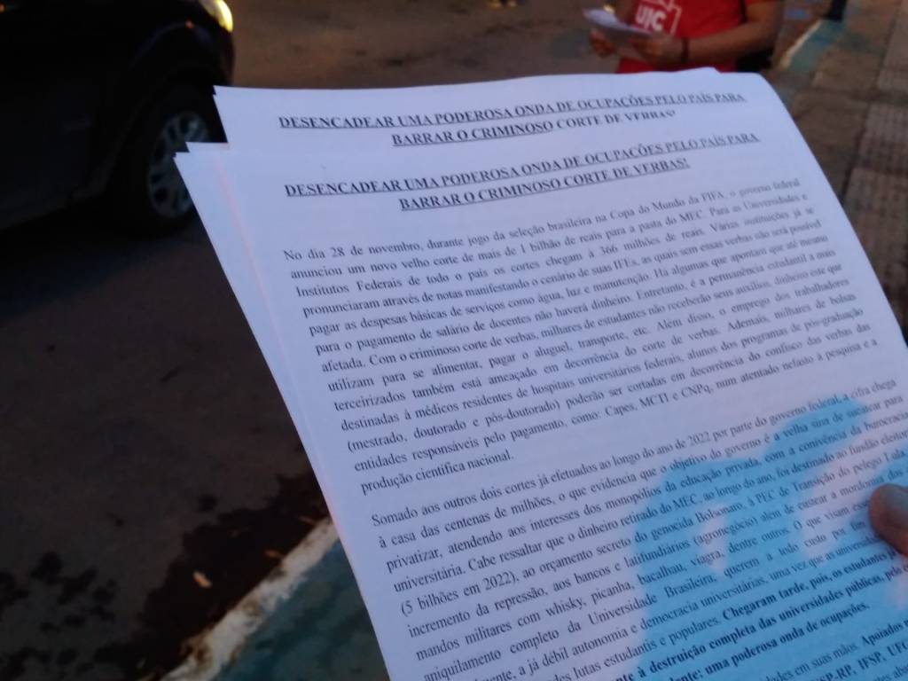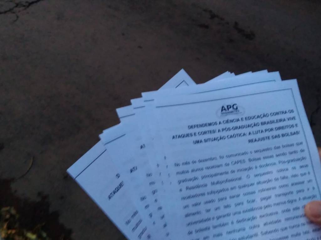 O ato ocorreu por volta de 18h00. Seiscentos panfletos foram distribuídos, contando os da APG e os da ExNEPe. O da APG denunciava os cortes de bolsas e o da ExNEPe chamava os estudantes a desencadear uma onda de ocupações por todo o país. O trânsito foi contido e muitos motoristas declararam seu apoio à manifestação. No microfone, eram denunciados os cortes nas universidades e era feito um chamado a todos se mobilizarem na defesa do ensino público e gratuito.