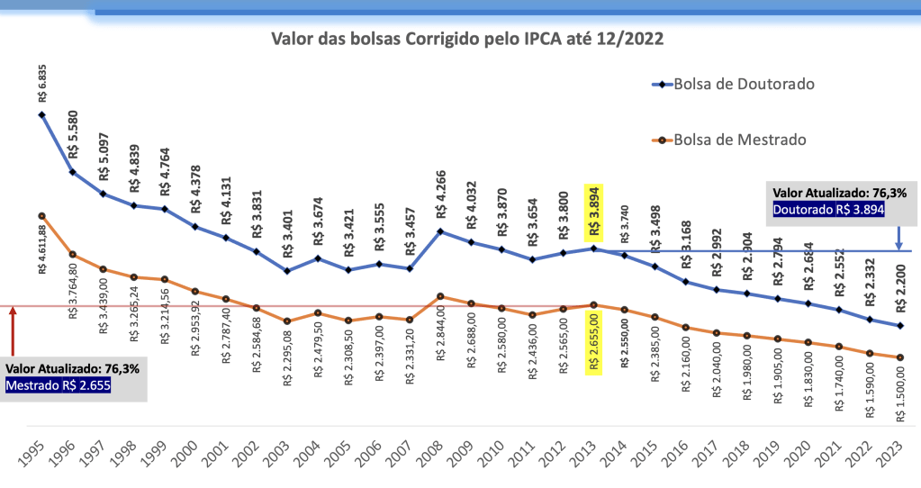 Constata-se que a defasagem de abril de 2013 a dezembro de 2022, segundo o IPCA, índice que mede a inflação, alcança 76,3%. Em recente manifestação, o Ministro da Educação, Camilo Santana informou que até o final do mês de janeiro deverá ser anunciado o reajuste das bolsas da Capes e do CNPq. O percentual buscado é de 40% de reajuste, o que é bastante expressivo, porém, não é ainda suficiente para recompor integralmente o valor da bolsa de 2013.