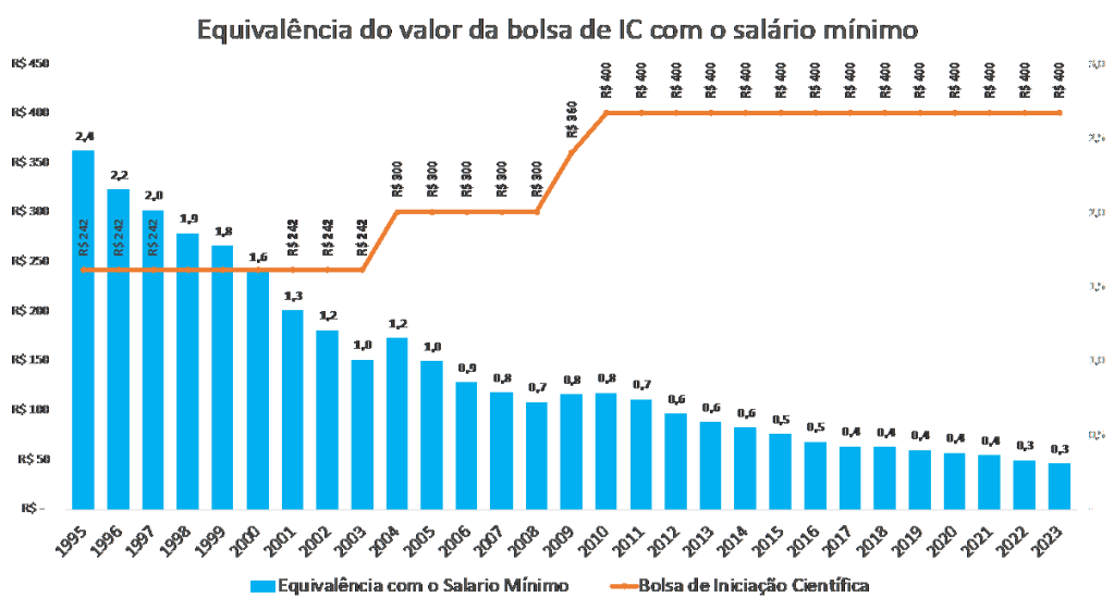 No entanto, no caso do CNPq, 85% das bolsas estão com uma defasagem ainda maior, pois o último reajuste ocorreu em março de 2010, por meio da RN-005/2010. É preocupante a situação de mais de 32 mil bolsistas de IC e iniciação tecnológica (IT), que recebem R$ 400,00, ou dos mais de 13 mil estudantes do ensino médio que recebem bolsa de IC júnior, no valor de R$ 100,00 por mês. Estes bolsistas precisam dedicar no mínimo 8 horas por semana em atividades de pesquisa para fazer jus à bolsa. Esta bolsa deveria servir de atrativo para que jovens cientistas tomassem gosto pela ciência, independente da carreira que viessem a seguir após a conclusão da formação acadêmica. Num passado não muito remoto, o valor da bolsa de IC superava o do salário mínimo. Atualmente, corresponde a menos de um terço do salário mínimo, como pode ser observado no gráfico abaixo. As consequências desta defasagem são sentidas nos grupos de pesquisa e têm reflexos negativos na produção científica, no desenvolvimento tecnológico e na inovação.