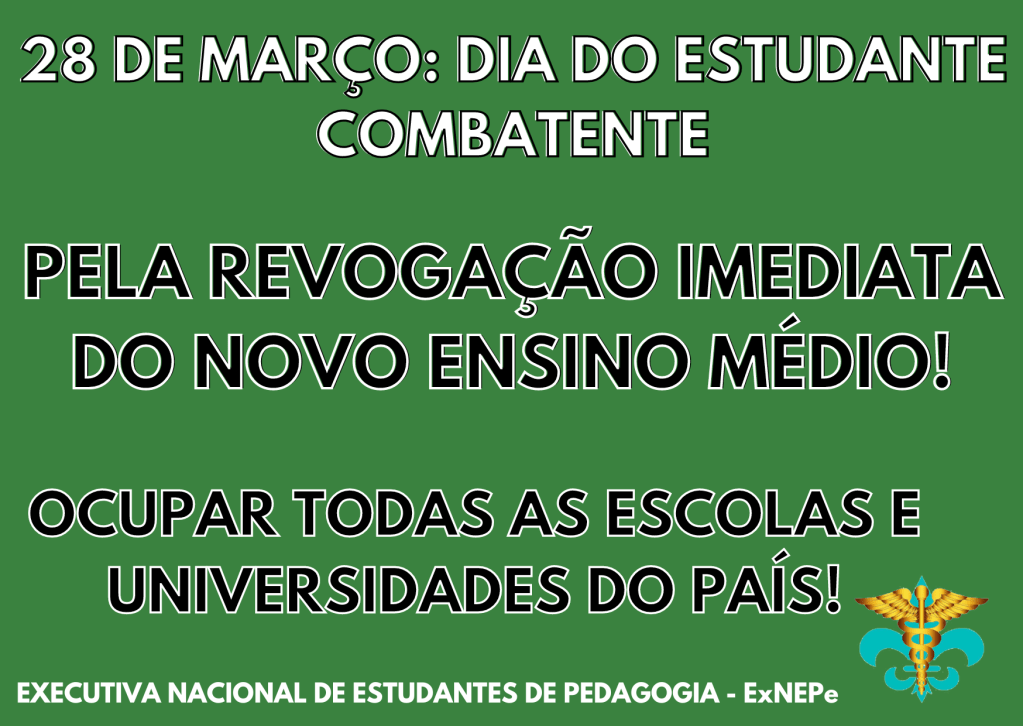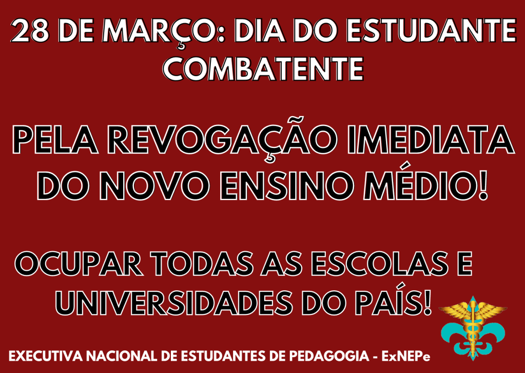Por tudo isto, a ExNEPe convoca a todos estudantes universitários e secundaristas a lançarem-se numa poderosa onda de manifestações pelas escolas do Brasil no próximo dia 28 de março, Dia do Estudante Combatente, pela revogação imediata do Novo Ensino Médio! Essa contrarreforma não serve nem aos estudantes, nem aos professores, serve exclusivamente aos grandes conglomerados do ensino privado que enchem os olhos com os lucros exorbitantes que o novo ensino médio pode lhes proporcionar. Portanto, somente os estudantes, professores e demais trabalhadores do ensino, através da luta combativa e independente, é que podem barrar a implementação dessa criminosa contrarreforma. Urge desencadear uma poderosa onda de ocupação de todas as escolas e universidades do país pela revogação imediata do novo ensino médio, tornando as escolas e universidades verdadeiras trincheiras da luta de classes, expulsando os privatistas e demais inimigos do ensino público e gratuito e conquistando uma verdadeira gestão democrática, colocando assim, as escolas de todo o país a serviço do povo.