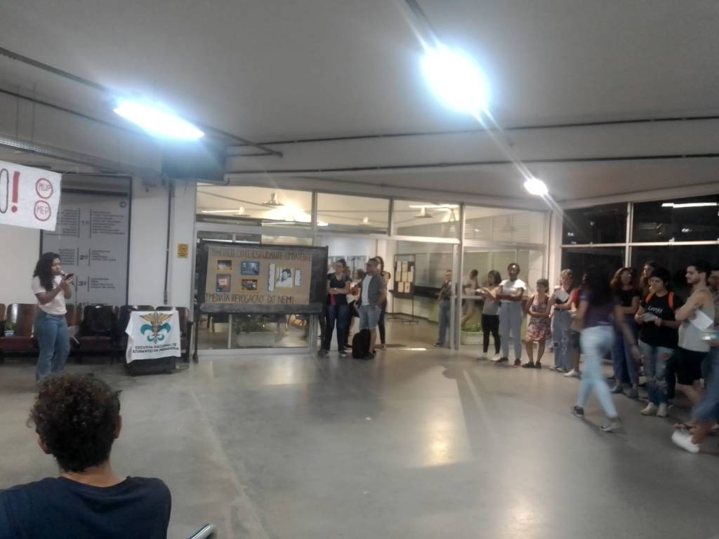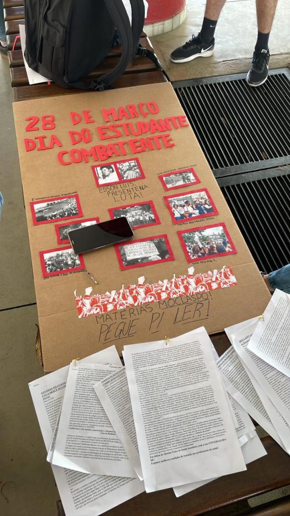 E para encerrar o dia, um ato foi organizado pela ExMEPe na Faculdade de Educação da UFMG, com agitação no hall do prédio, foram puxadas palavras de ordem e feita uma homenagem ao estudante Edson Luís. Um representante da ExMEPe fez a denúncia do NEM, seu caráter privatista e obscurantista, apontou a necessidade da luta pela revogação dar salto e não cair na demagogia de “reformar a reforma” do atual governo, e apontou como só uma nova onda de ocupações vai garantir a vitória estudantil e jogar o NEM na lata de lixo da história. Outra companheira da ExMEPe fez uma homenagem ao Edson Luís ao ler sua biografia e chamar a luta naquele dia para honrar seu legado, e junto foi prestada uma homenagem a Walkíria Afonso Costa, que foi estudante da FaE/UFMG e dá nome ao diretório acadêmico do prédio, grande heroína do povo. Outros estudantes e movimentos interviram, e ao fim foi colocado que aquele era só um passo, que muitas outras mobilizações seriam feitas. E a ExMEPe convocou os estudantes a dia 30/03 ao ato a ser realizado em frente a reitoria contra a ameaça de aumento do bandejão da UFMG.