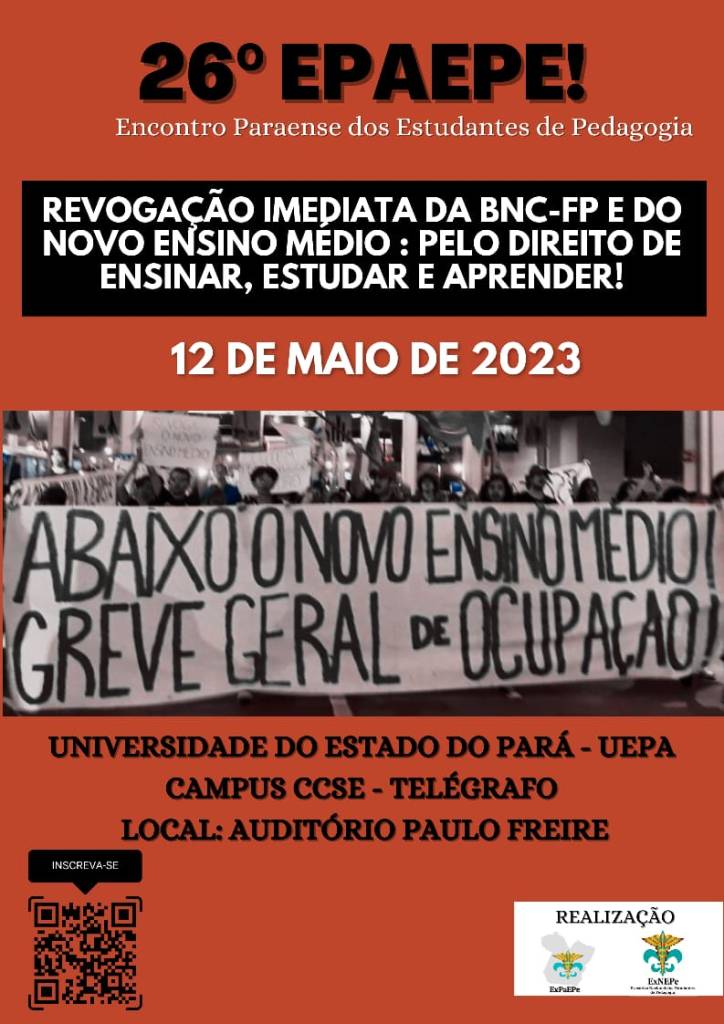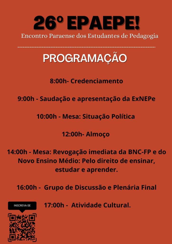 O tema do encontro será: REVOGAÇÃO IMEDIATA DA BNC-FP E DO NOVO ENSINO MÉDIO: PELO DIREITO DE ENSINAR, ESTUDAR E APRENDER! O EPAEPe é um encontro regional de caráter político, científico e cultural organizado pela Executiva Paraense dos Estudantes de Pedagogia (ExPaEPe) com o intuito de congregar entidades de estudantes de pedagogia, licenciaturas, professores e demais interessados de todo o Estado para debater o atual cenário da educação brasileira, bem como a luta para defender o ensino público e gratuito. As inscrições estão abertas! Para se inscrever basta apontar a câmera pro QR CODE do cartaz, ou acessar o link do formulário pelo link: https://docs.google.com/forms/d/e/1FAIpQLSew15kawc4ouDlEpJGC73dCGf4S0YpuTlBaBMQl9vq3GwMkmA/viewform