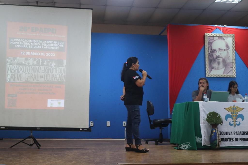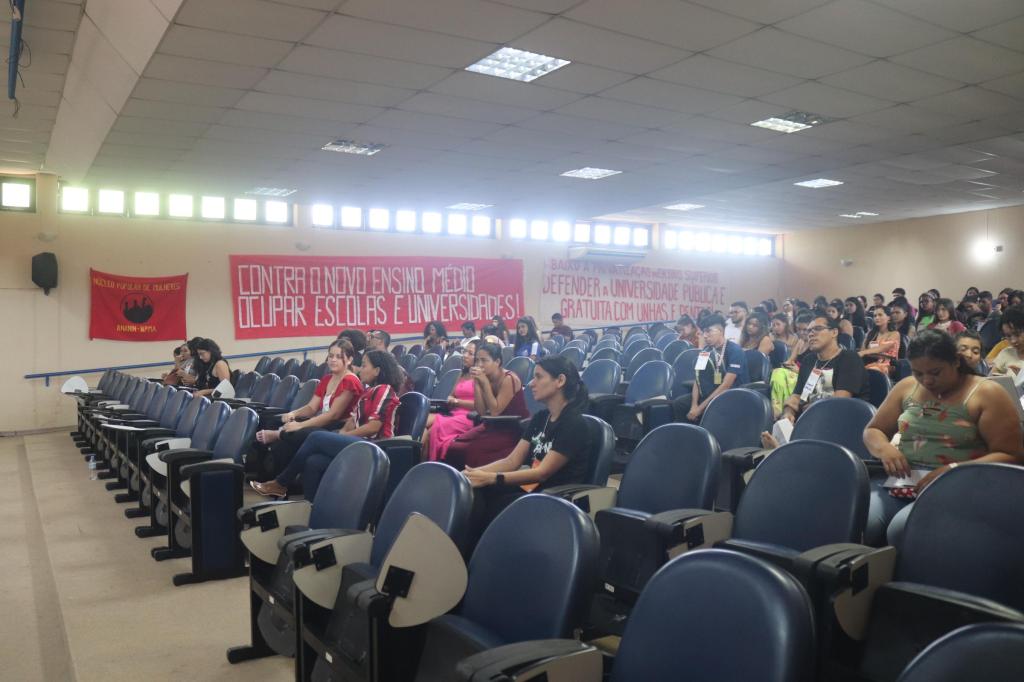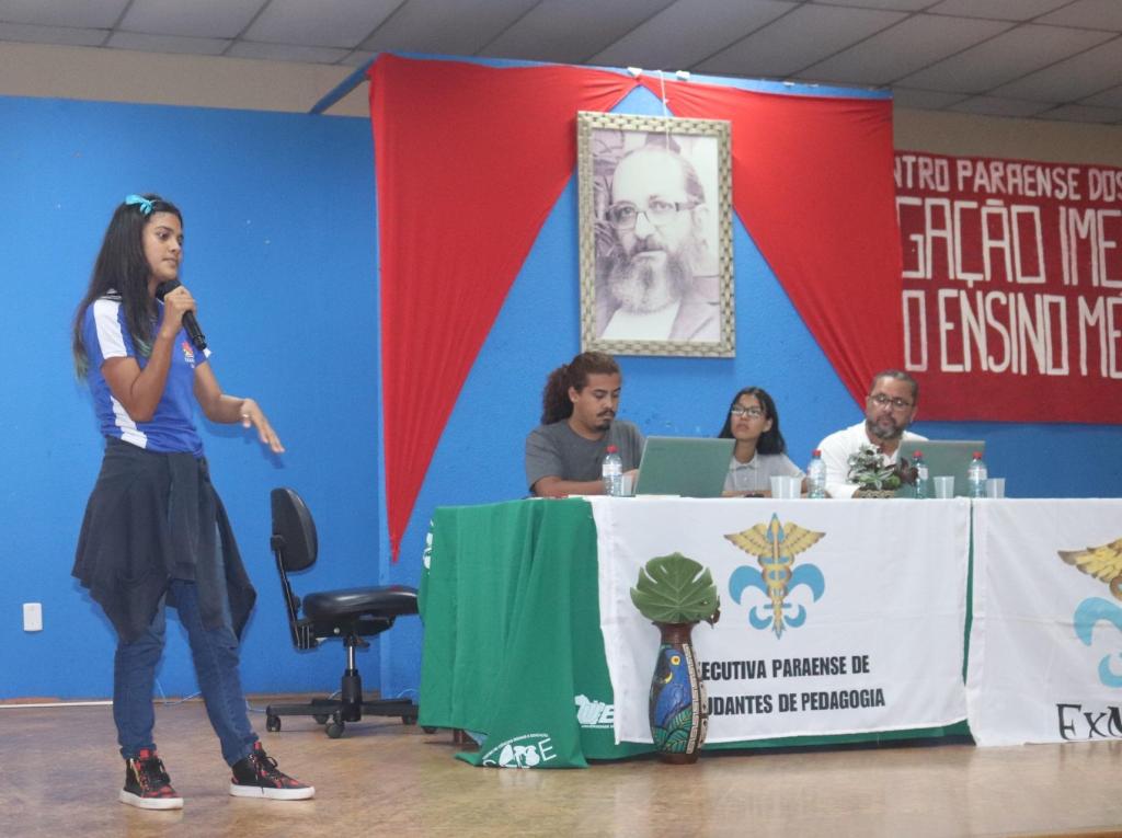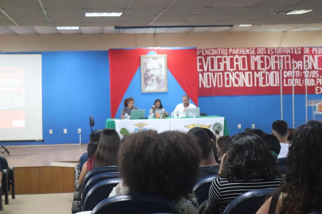 Ainda na mesa foi apresentado um vídeo, enviado pela professora de filosofia da rede estadual de ensino do Pará, Paula Menezes. Em sua fala, a professora, que não pôde comparecer presencialmente ao evento, fez esforço por contribuir com o debate, expôs como tem sido a experiência prática da aplicação do NEM nas escolas paraenses: uma extrema precarização da formação dos estudantes e também do trabalho docente; um grande engodo, reforma para inglês ver. Trouxe relato da realidade de pobreza e sucateamento da maioria das escolas. Após diversas intervenções foram feitas, onde os estudantes relataram experiências, fizeram denúncias. Uma secundarista interviu relatando como tem sido caótico a aplicação do NEM em sua escola, que é geral o descontentamento com o NEM. Ao fim da mesa puxaram “1, 2, 3, 4 5 mil! Revoga a reforma ou paramos o Brasil!” e “Pedagogia é união! Não deixa o MEC acabar com a educação!”