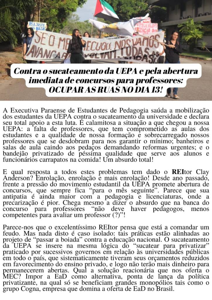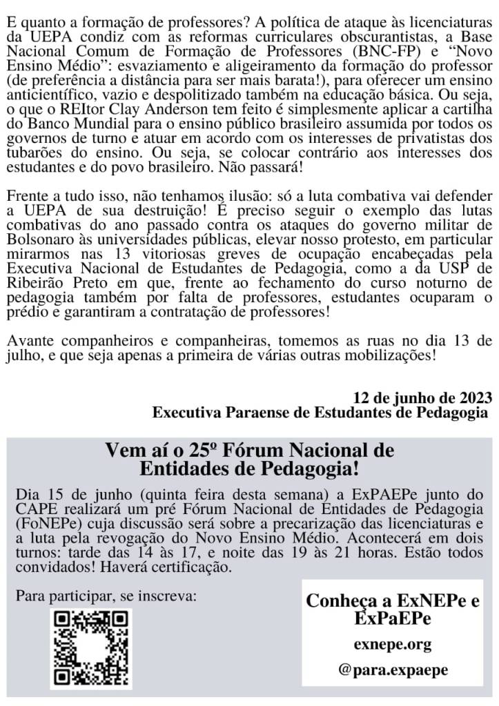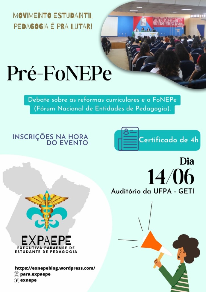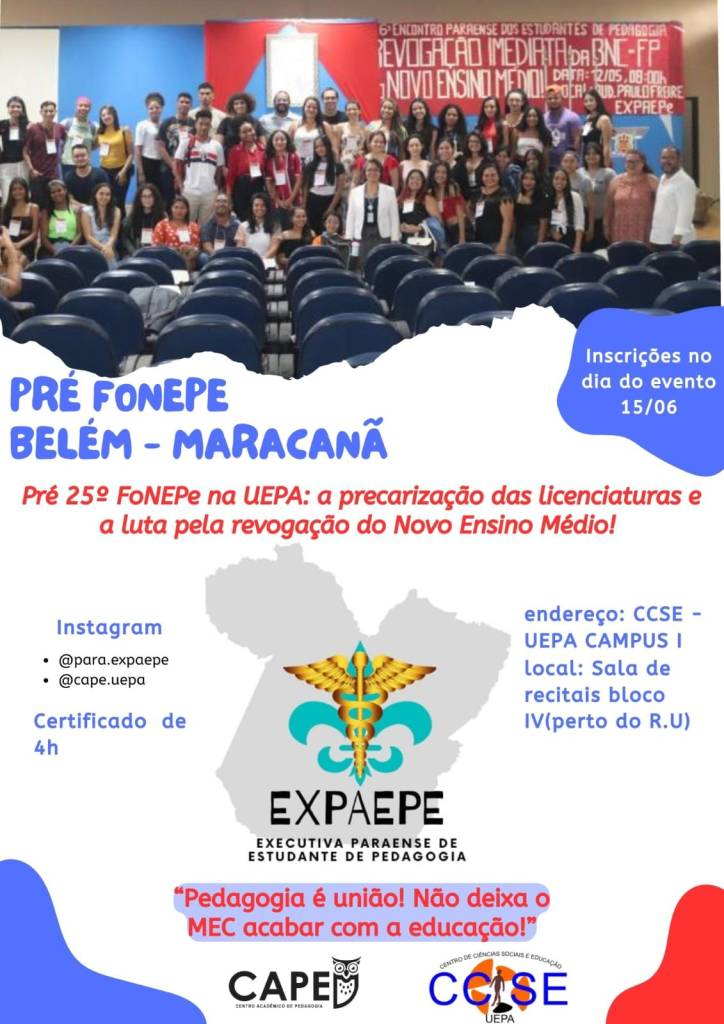 Em seguida, no dia 15/06 haverá o pré fonepe na Universidade do Estado do Pará, campus CCSE em Belém. O pré encontro acontecerá em dois turnos (tarde e noite), e será realizado em conjunto com o Centro Acadêmico de Pedagogia (CAPE). O pré fonepe na UEPA terá um significado especial, pois acontecerá dois dias depois de uma manifestação marcada para o dia 13/06 a qual a ExPAEPe tomará parte, contra a precarização da UEPA e exigindo contratação de professores. Os cursos da UEPA, em particular as licenciaturas e em especial o de pedagogia estão numa situação calamitosa pela falta de professores na capital e interior. Diversas disciplinas são ofertadas sem que haja professores para lecioná-las, todas as semanas alunos vão embora mais cedo por falta de professor, e veem sua formação prejudicada. Na UEPA, o pré fonepe terá como tema “Contra a precarização das licenciaturas e pela revogação imediata do Novo Ensino Médio!”.