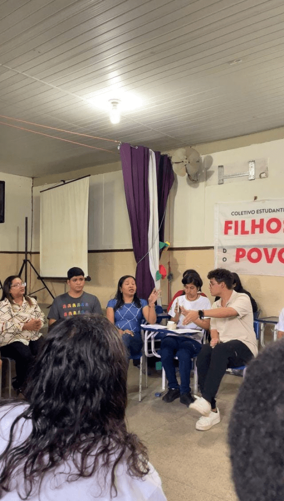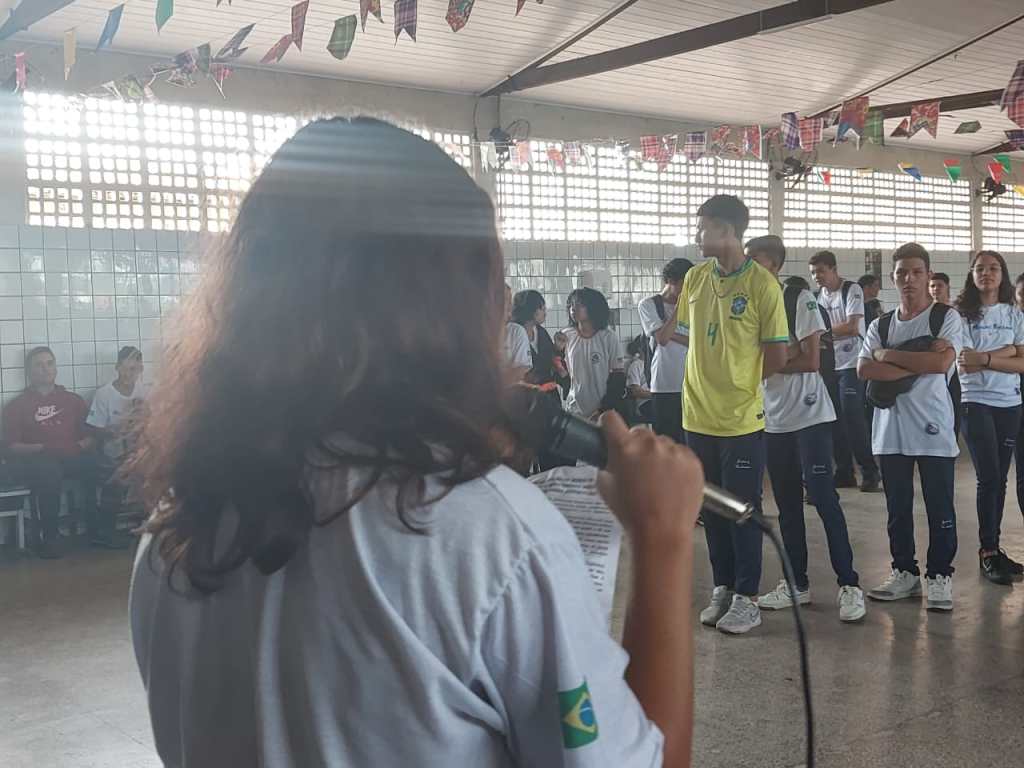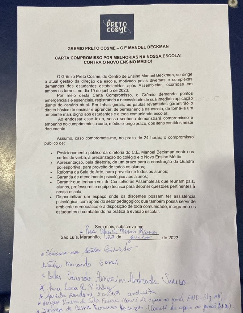 Os representantes do Grêmio Preto Cosme leram em voz alta a carta compromisso, sendo puxado gritos de guerra e aplausos a cada demanda lida. Após, os estudantes realizaram falas efusivas acerca da condição precária da sua escola e da realidade danosa do “Novo” ensino médio, exigindo ao Estado e a gestão a responsabilidade de acatar suas demandas.
