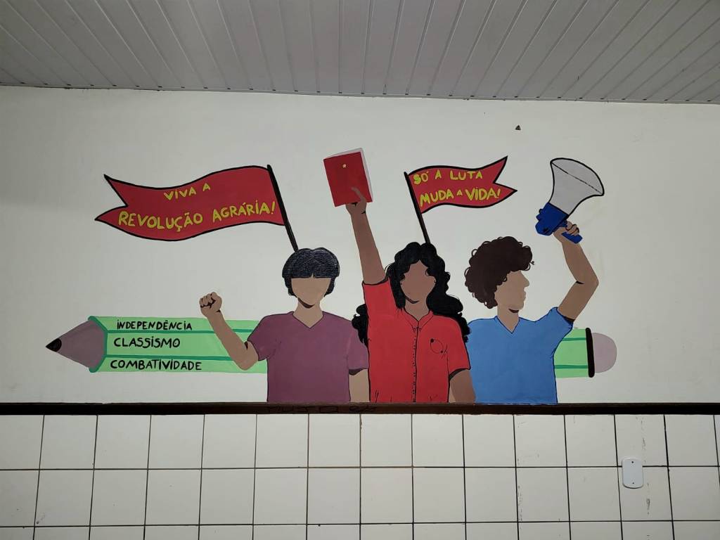 “Arte à serviço dos estudantes em Ocupação, inspirada em representações da juventude combatente que luta no país. Fiz o mural em apoio à greve de ocupação no C.E. Manoel Beckman pela revogação do “Novo” ensino médio e a fim de exaltar os princípios de classismo, independência e combatividade e as consignas de apoio à luta pela revolução agrária, inseparáveis do novo movimento combativo estudantil. Arte de Nova Cultura para mostrar que “de novo não tem nada, o “novo” ensino médio na verdade é uma cilada!”.