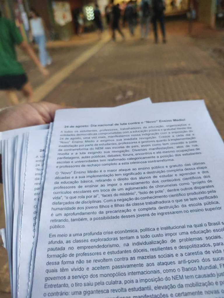 No dia 24 de agosto (Dia Nacional de luta contra o novo ensino médio), foi realizado panfletagens nas escolas: Colégio Estadual Cívico Militar Érico Veríssimo para as turmas da manhã e da tarde, e no Colégio Estadual José Marcondes Sobrinho, para as turmas do integral e do noturno. Esta atividade foi realizada pela Frente Contra o “Novo” Ensino Médio de Laranjeiras do Sul respondendo ao chamado da Executiva Nacional dos Estudantes de Pedagogia. Foram distribuídos no total 350 panfletos nas escolas estaduais e 150 panfletos na Universidade Federal da Fronteira Sul no período da noite.