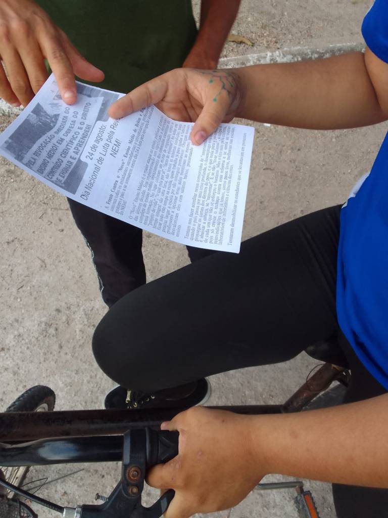 Atendendo ao chamado da Executiva Nacional dos Estudantes de Pedagogia (ExNEPe) o Coletivo de Base – Honestino Guimarães (CB-HG) distribuiu nos dias 24/08 e 25/08 mais de trezentos panfletos contra o “Novo” Ensino Médio para estudantes do Centro de Ensino Médio 414 de Samambaia. Os panfletos foram recebidos com grande entusiasmo pelos estudantes, alguns pediram mais exemplares para distribuir entre os colegas e ajudaram ativamente na panfletagem.