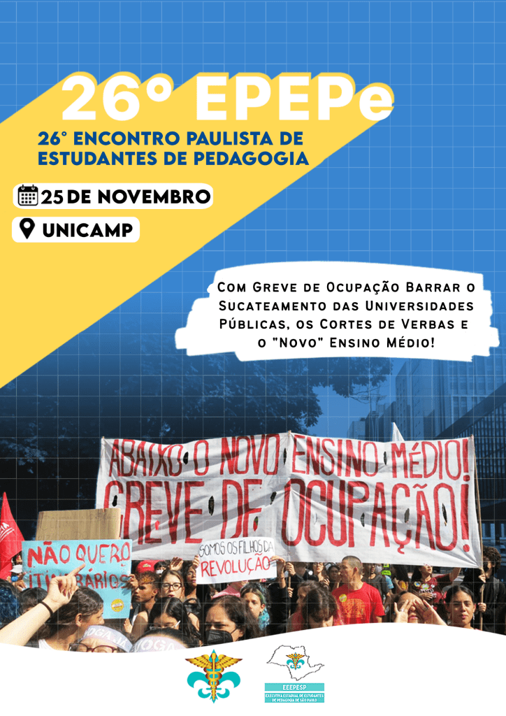 A Executiva Estadual de Estudantes de Pedagogia de São Paulo (EEEPe-SP) convida estudantes de pedagogia e licenciatura, secundaristas, professores, ativistas, Centros Acadêmicos e grêmios de todo o estado para o 26° Encontro Paulista de Estudantes de Pedagogia (EPEPe). O evento ocorrerá entre os dias 25 de novembro, na Unicamp, com o seguinte tema: “Com Greve de Ocupação Barrar o Sucateamento das Universidades Públicas, os Cortes de Verbas e o “Novo” Ensino Médio!”.