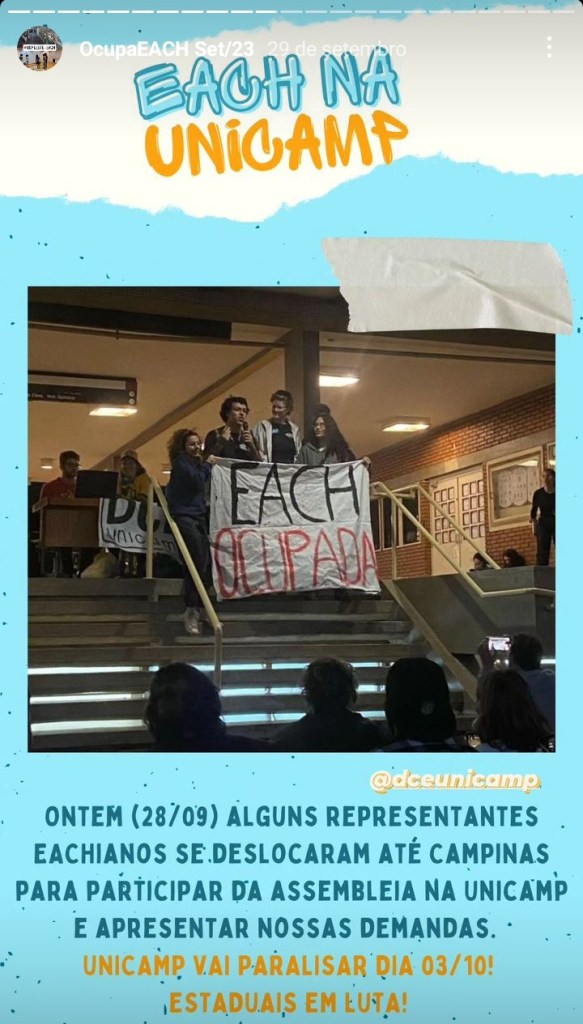 A expectativa é que na segunda-feira, dia 9, ocorra a próxima e derradeira negociação das demandas restantes. Até lá, a EACH segue firme mobilizando e dando exemplo com sua combativa greve de ocupação.