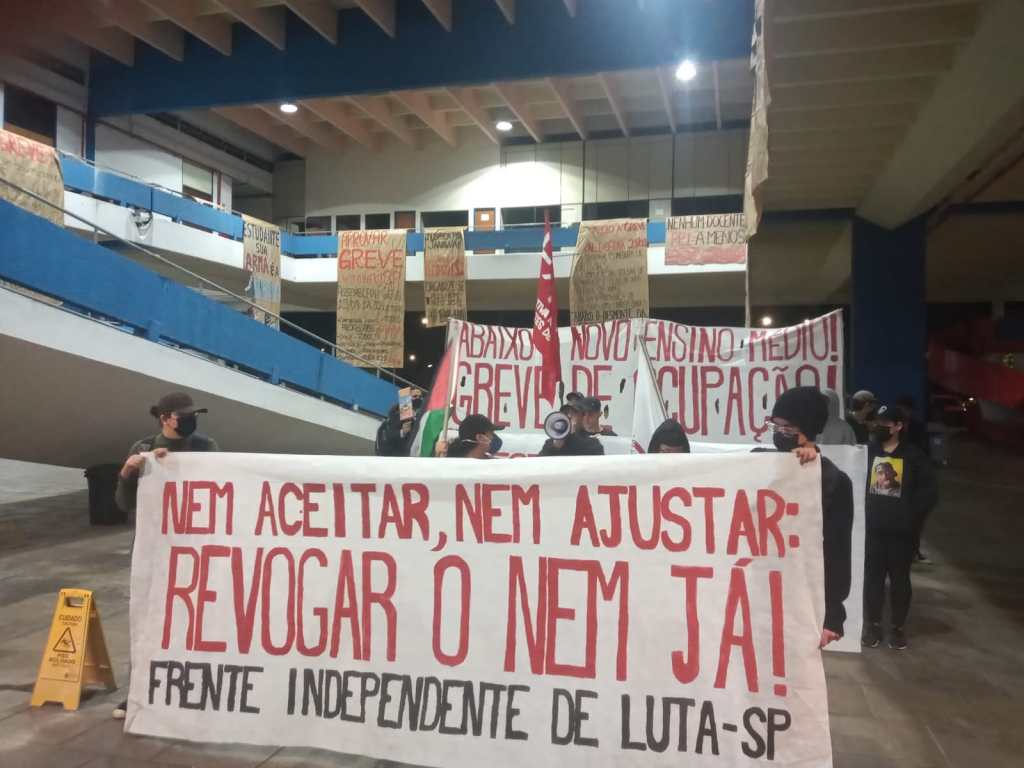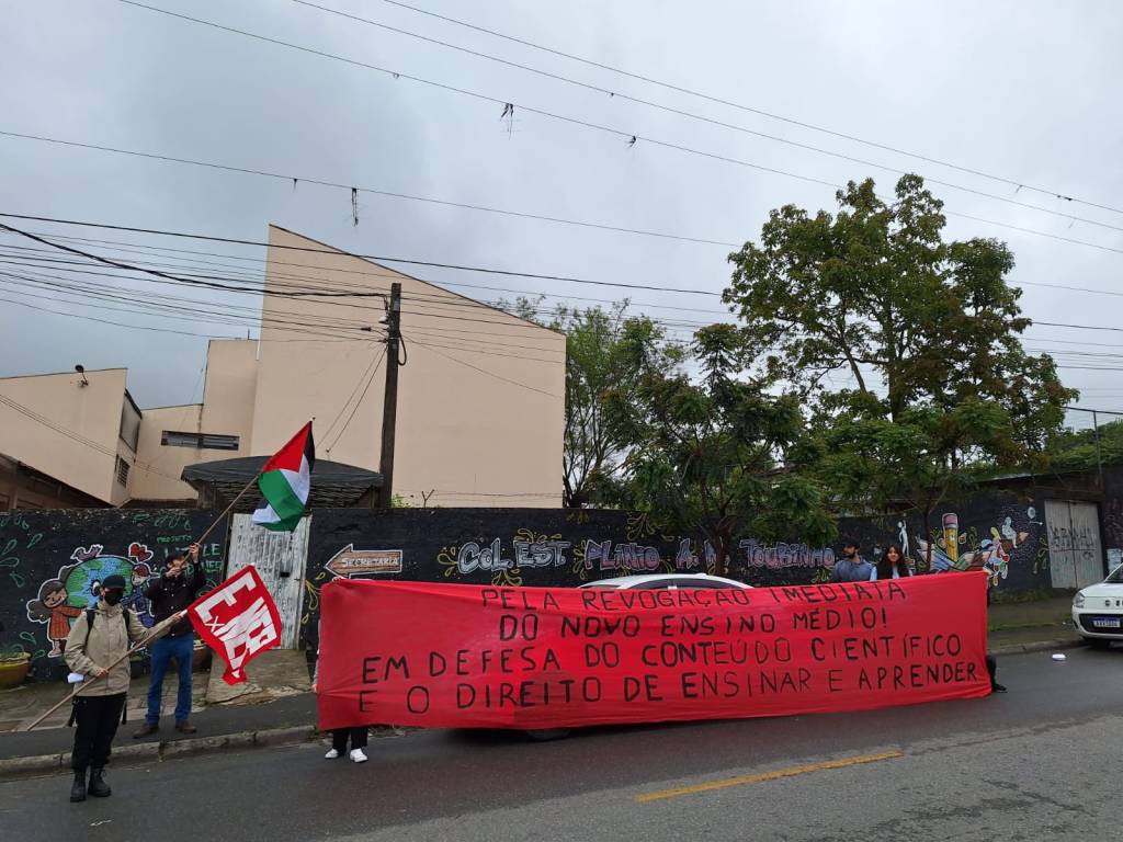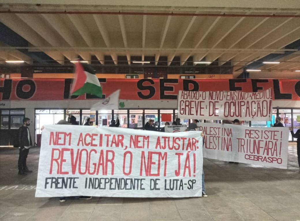 A Frente Independente de Luta Contra o “Novo” Ensino Médio de São Paulo (FIL-SP) organizou no fim da tarde uma aula pública e um ato contra o “Novo” Ensino Médio e em solidariedade a heroica luta do povo palestino. Também participaram a Executiva Nacional de Estudantes de Pedagogia (ExNEPe), Cursinho Popular da FFLCH, Coletivo Mal-educado e o Coletivo Aroeira. O evento ocorreu no vão do prédio da Geografia e História da FFLCH USP, que já está em greve estudantil há mais de um mês, visando unir a luta secundarista com a luta universitária.