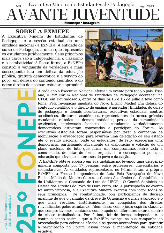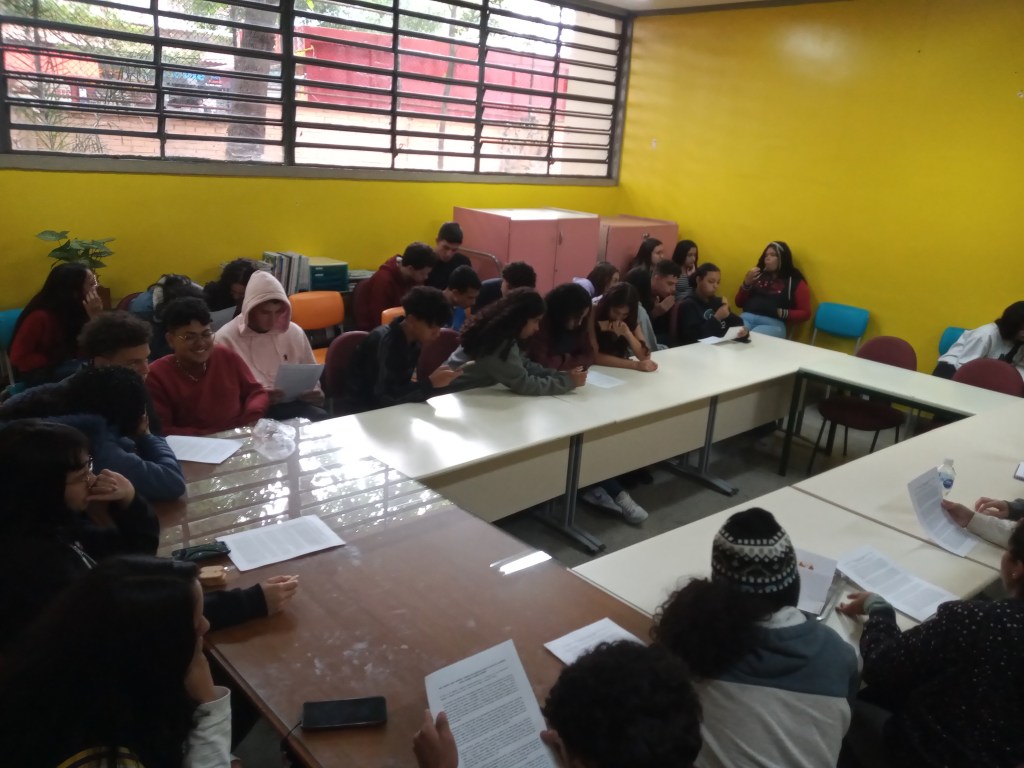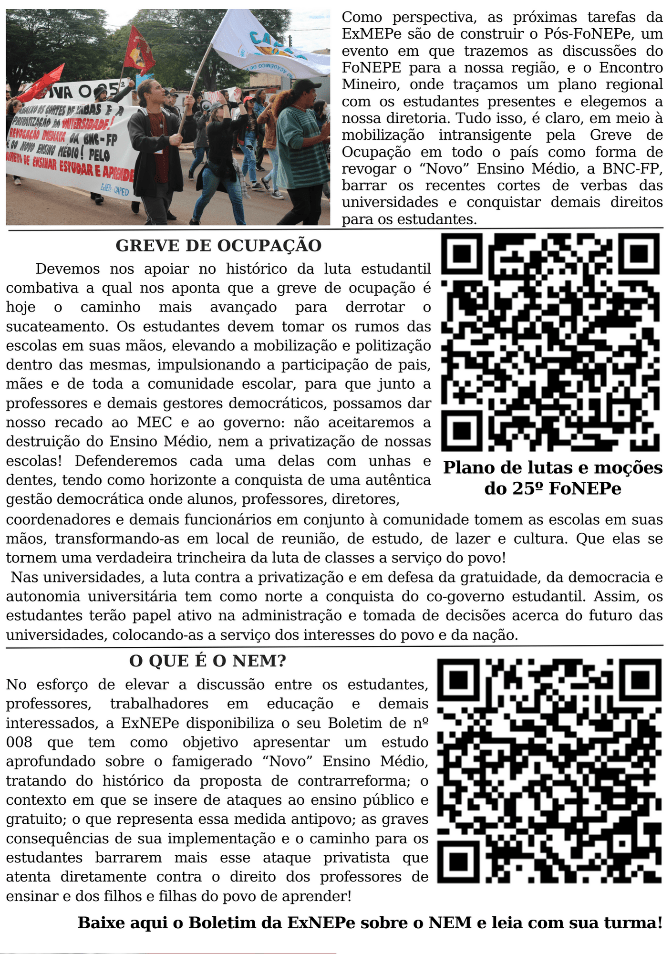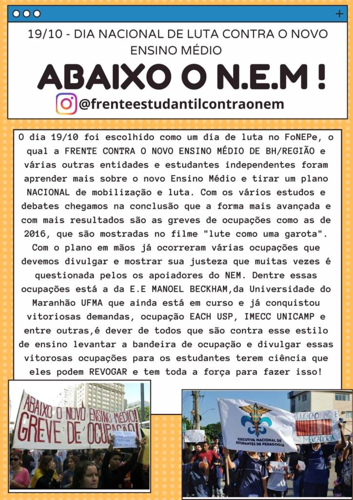 Recentemente, os alunos do “Novo” Ensino Médio de uma Escola Estadual de Belo Horizonte postaram no Instagram um vídeo de denúncia sobre o fechamento de turmas que ocorreu no colégio em decorrência da ampla evasão escolar. Estudantes que haviam escolhido um itinerário na área das Ciências Biológicas foram obrigados a se juntarem com turmas de um Itinerário da Área das Ciência Humanas, e agora não terão aula de suas matérias específicas pelo menos até o final do ano. Assim, a ExMEPe entrou em contato e organizou uma atividade em sua escola. Nisso, os companheiros foram recebidos com muito prestígio pelos estudantes e professores. Um professor apresentou inúmeras denúncias do fracasso que é o NEM na escola, onde nas quintas feiras ele ministra uma aula de uma hora e meia para 4 turmas de séries diferentes. Durante o restante da semana, dá aulas completamente desconexas à sua formação acadêmica, o que é motivo de forte frustração para ele. O professor cedeu uma aula de quinta feira com grande entusiasmo para a realização do Pós-FoNEPe, e foi escolhido o dia 19 para somar ao dia nacional de luta contra o NEM.