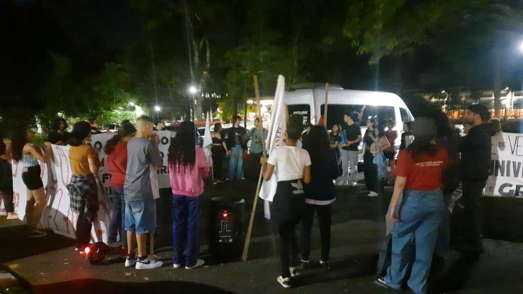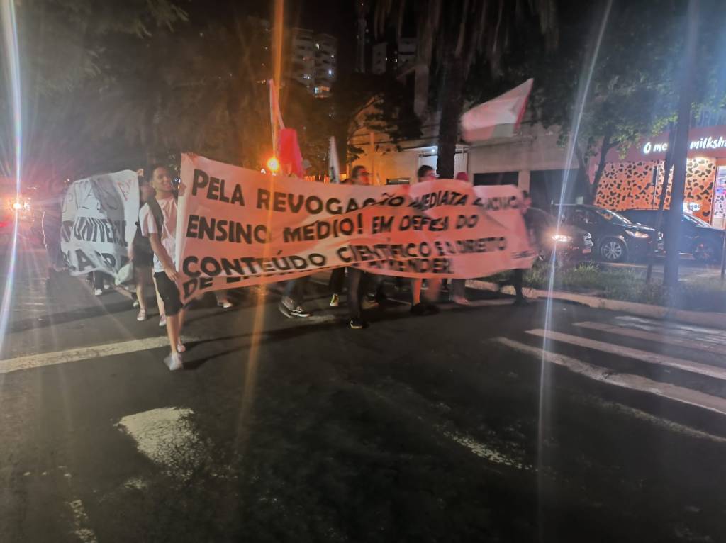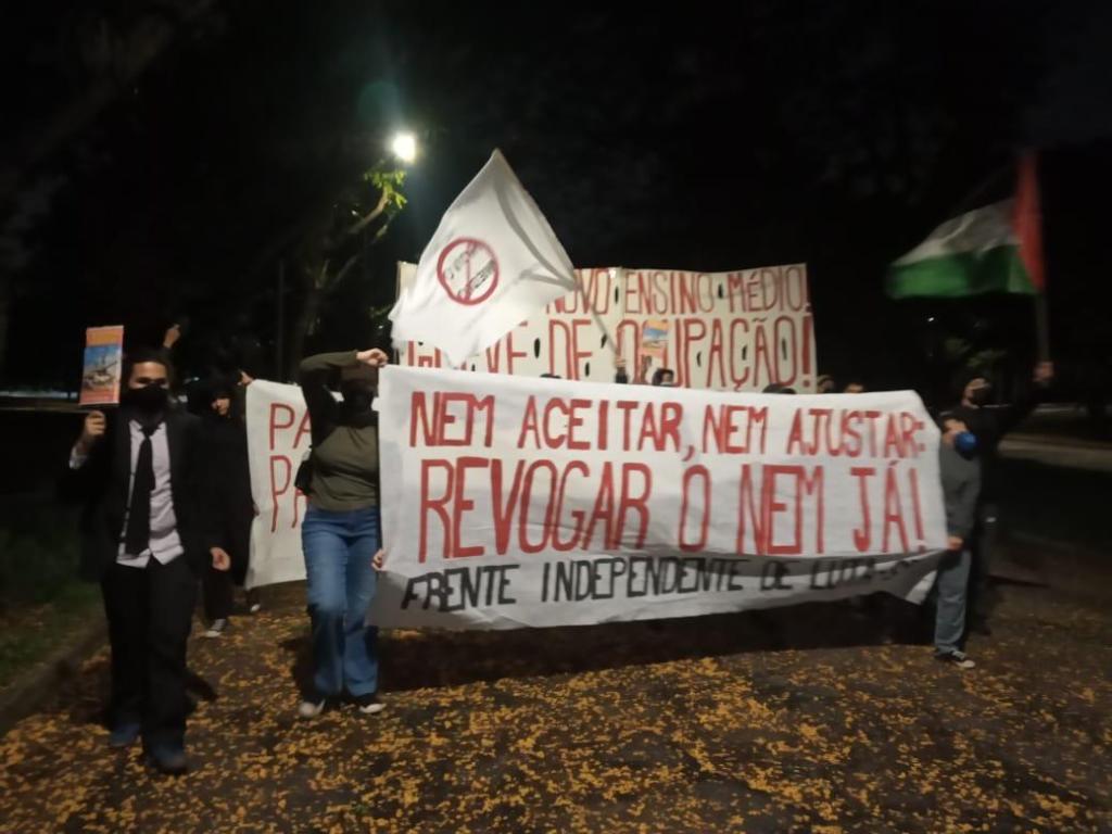 Após o debate se organizou um protesto aos arredores do campus empunhando faixas com os dizeres “Nem Aceitar, Nem Ajustar: Revogar o NEM Já!”, “Abaixo o Novo Ensino Médio! Greve de Ocupação!”, assinadas pela FIL-SP e mais uma: “Palestina Resiste! Palestina Triunfará!”. Durante o trajeto, os manifestantes agitaram a Cidade Universitária entoando palavras-de-ordem como “Não tem defesa, Não tem remédio, Revoga já o novo ensino médio!”, “Para barra a precarização, Greve geral greve geral de ocupação!” e “Povo do Iraque e Palestina, Sua luta continua na América Latina!”