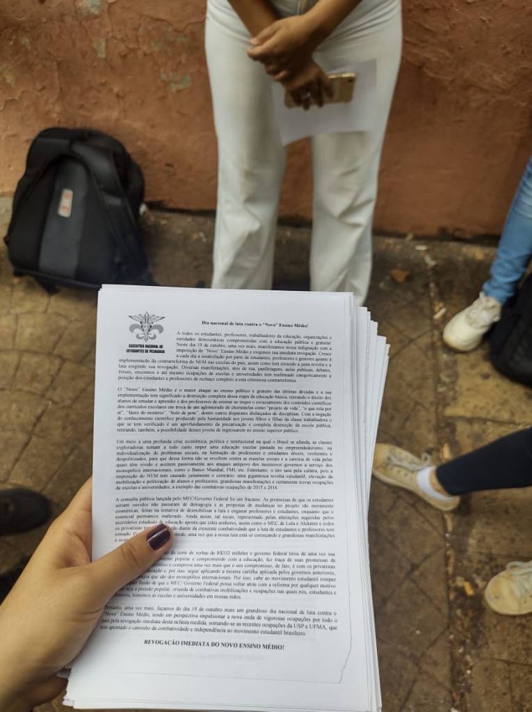 Em Goiânia, no dia 19/10, estudantes de pedagogia realizaram atividades de panfletagem nas escolas CEPI Dom Abel e CEPI Pré-universitário. Muitos panfletos foram distribuídos convidando os estudantes secundaristas para se juntar à mobilização contra o NEM. Além de demarcar a importância da greve de ocupação como tática de luta para conseguir a imediata revogação da medida.