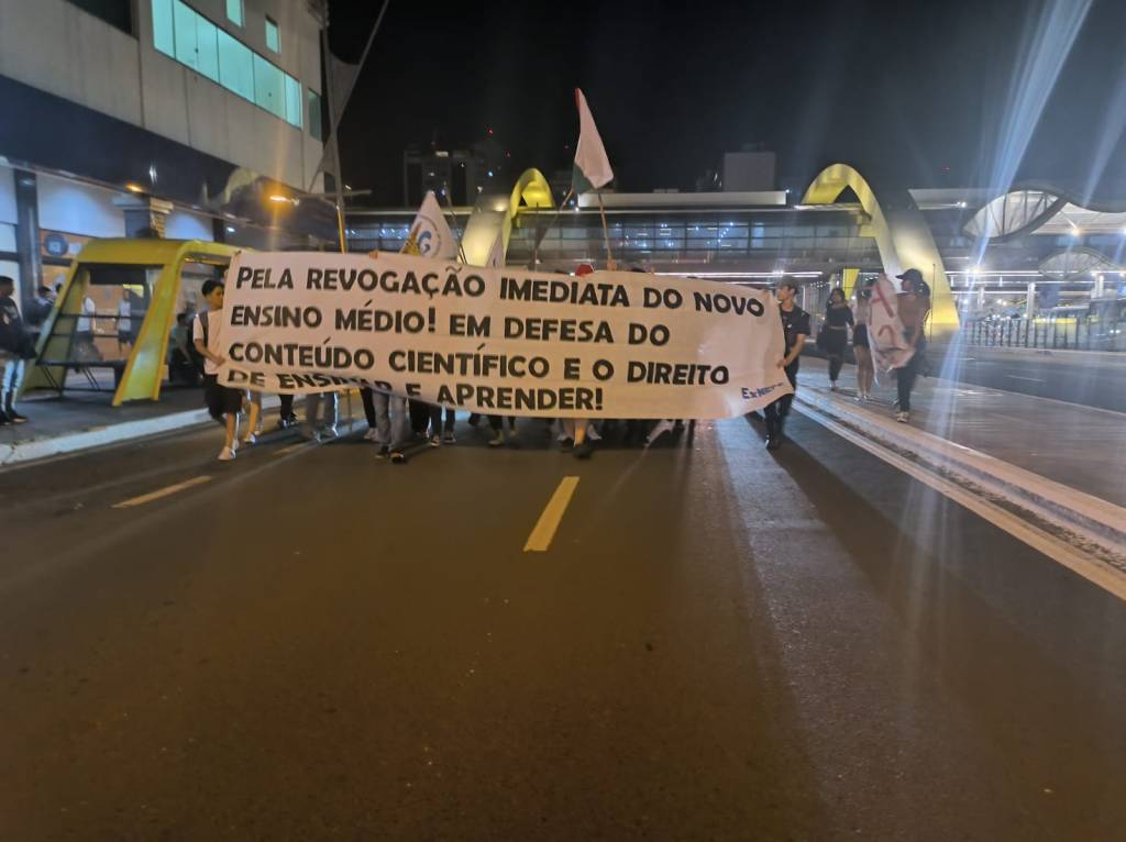 Em Maringá, norte do Paraná, o Dia Nacional de Luta Contra o NEM contou com uma combativa manifestação, chamada pelo recém-eleito Diretório Central dos Estudantes – UEM Presente, que em sua campanha defendeu a luta combativa e independente dos estudantes e colocou-se firmemente contra o Novo Ensino Médio. Dezenas de estudantes, entre eles alunos da Pedagogia, Psicologia, Geografia, Ciências Sociais, Matemática, História e Economia marcharam pelas ruas do centro da cidade, rumo ao terminal central. A seu lado marcharam estudantes do ensino fundamental e médio de colégios de Sarandi e Maringá, que atenderam ao chamado da manifestação e expressaram todo o ardor da juventude que está disposta a lutar contra o NEM com unhas e dentes. Na manifestação era possível ver, entre as faixas e bandeiras tremular a invencível bandeira da Palestina, símbolo máximo da resistência dos povos do mundo contra a opressão, a qual a ExNEPe tomou como sua neste dia 19. Ao fim da manifestação, de volta à universidade, os estudantes fizeram um balanço, no qual se comprometeram com manter viva a luta contra o NEM e aplicar a greve de ocupação como principal tática de resistência contra as reformas e cortes de verbas realizados pelo governo federal e estadual, inspirando-se nas vitoriosas ocupações da USP, UNICAMP e UFMA.