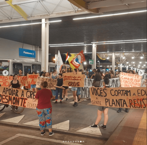 Por fim, encerramos o dia com uma grande manifestação que reuniu dezenas de estudantes, professores e apoiadores da comunidade externa. A concentração aconteceu em frente ao RU e, em seguida, os manifestantes marcharam pelas ruas de Maringá entoando palavras de ordem como “Ratinho Jr., cara de pau! É funcionário do banco mundial!”, “Para barrar a privatização, greve geral greve geral de ocupação”, dentre outras. Com muito ânimo, os participantes passaram por dentro do terminal urbano e fizeram uma intervenção em forma de jogral para comunicar à população a razão do protesto. No retorno à Universidade, o balanço da atividade foi extremamente positivo, com estudantes de diversos cursos expressando sua concordância com a greve e ressaltando as conquistas obtidas até o momento.