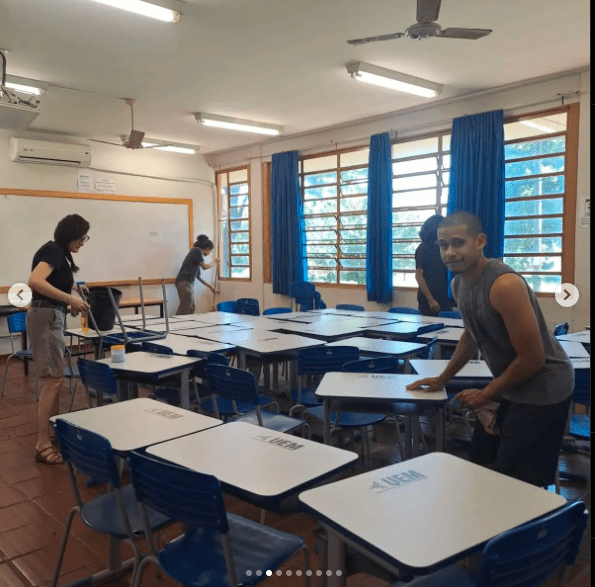 É importante denunciar que o departamento de Geografia possui apenas um funcionário para limpeza do bloco inteiro, o que não se trata de caso isolado. O sucateamento da universidade pública atinge as mais diversas esferas da UEM, incluindo os serviços de limpeza e manutenção. Frente a isso, os estudantes dedicaram a manhã do sábado para a limpeza do bloco para garantir melhores condições aos alunos e professores que utilizam os espaços, visto que a própria universidade não consegue garantir tal serviço tão básico.