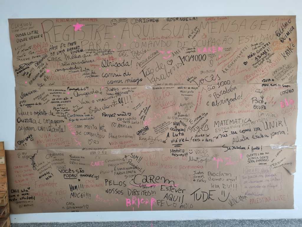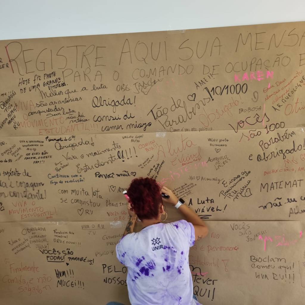 Como parte da ornamentação do espaço o comando de ocupação estudantil deixou um mural disponível para que os estudantes pudessem deixar ali uma mensagem. Na oportunidade, centenas de alunos utilizaram o mural para saudar o movimento estudantil da UNIR, vários eles deixaram desabafos evidenciando o quão árduo é fazer ciência com fome, além de expressarem sua indignação com a burocracia universitária. O apoio para com os estudantes em ocupação também se estendeu a dezenas de professores, centros acadêmicos, entidades democráticas e comunidade em geral, que contribuíram com doação de alimentos e dinheiro para possibilitar as atividades. Ressaltando, mais uma vez, a importância e justeza dessa luta.