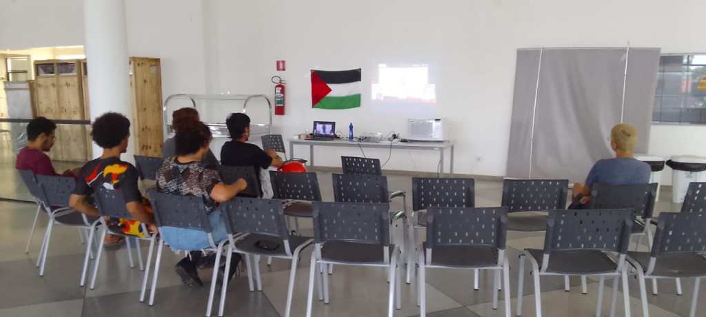 Ainda no decorrer da manhã, em atividade aberta a comunidade acadêmica, realizou-se uma roda de conversa sobre a “Questão Palestina”. Após assistirem a um trecho da entrevista do programa A Propósito, produzido pelo Jornal A Nova Democracia, com o presidente da FEPAL, Ualid Rabah, os participantes discutiram os acontecimentos na faixa de gaza e cisjordânia ocupada, assim como a repercussão da guerra de agressão sionista na imprensa e o apoio crescente a resistência palestina.