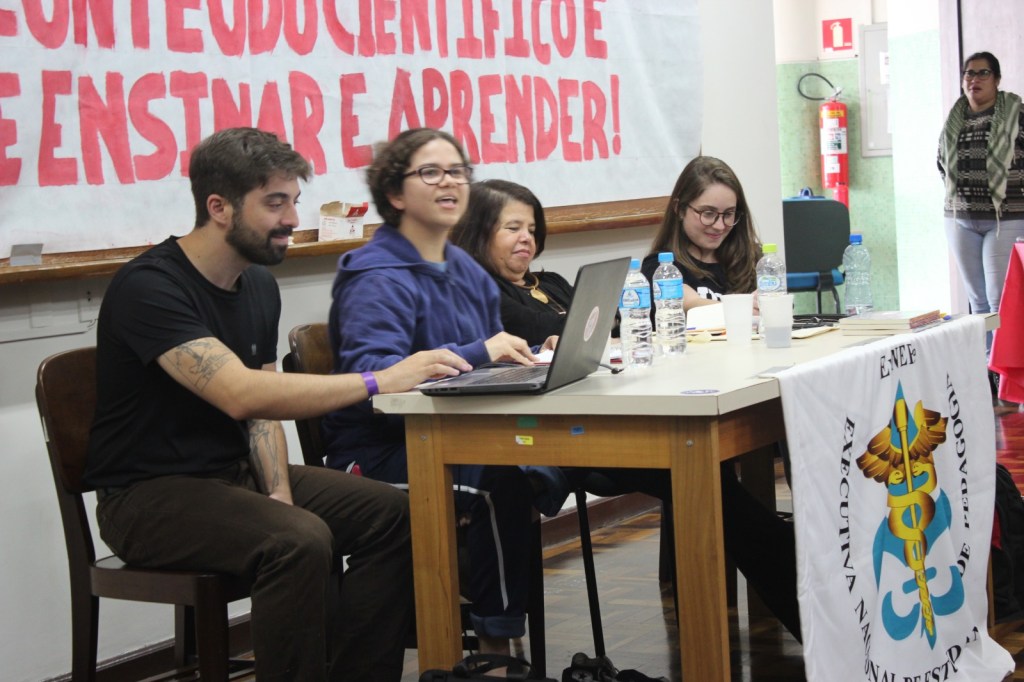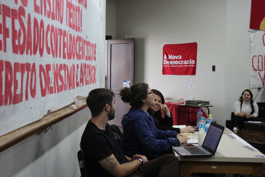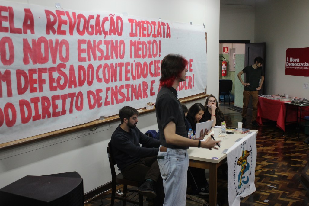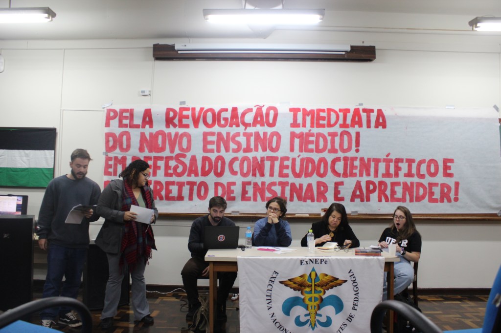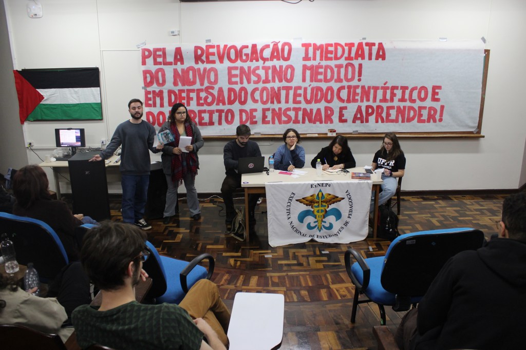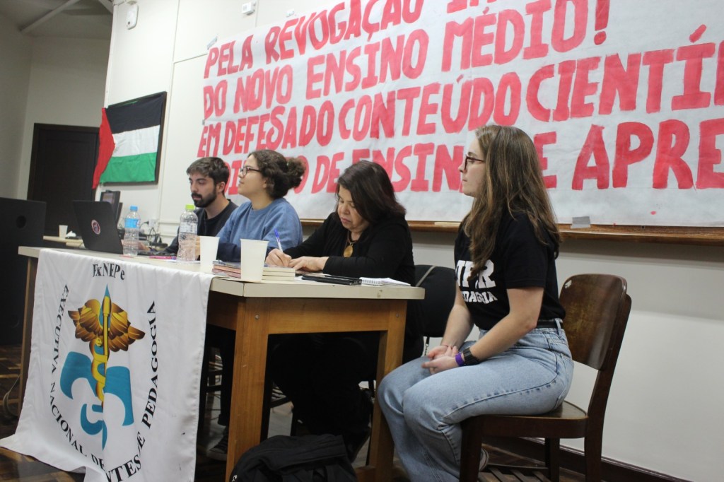 A mesa sobre o Novo Ensino Médio contou com a participação da Doutora Mônica Ribeiro – coordenadora do Observatório do Ensino Médio e a maior referência sobre o assunto no campo da educação, lutando há décadas contra a precarização do Ensino Público -, de uma estudante secundarista do local e do estudante de pedagogia Antônio Nogueira – presidente da Executiva Nacional de Estudantes de Pedagogia.