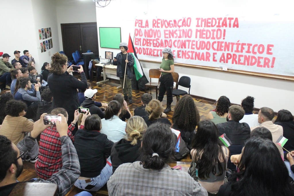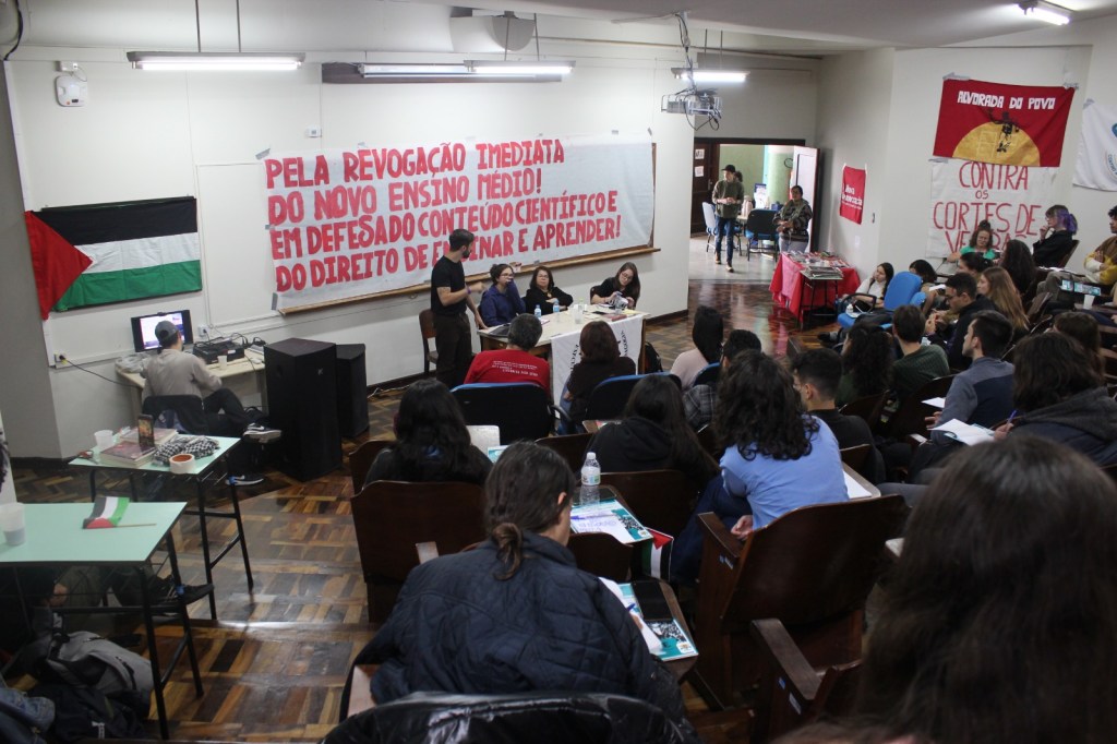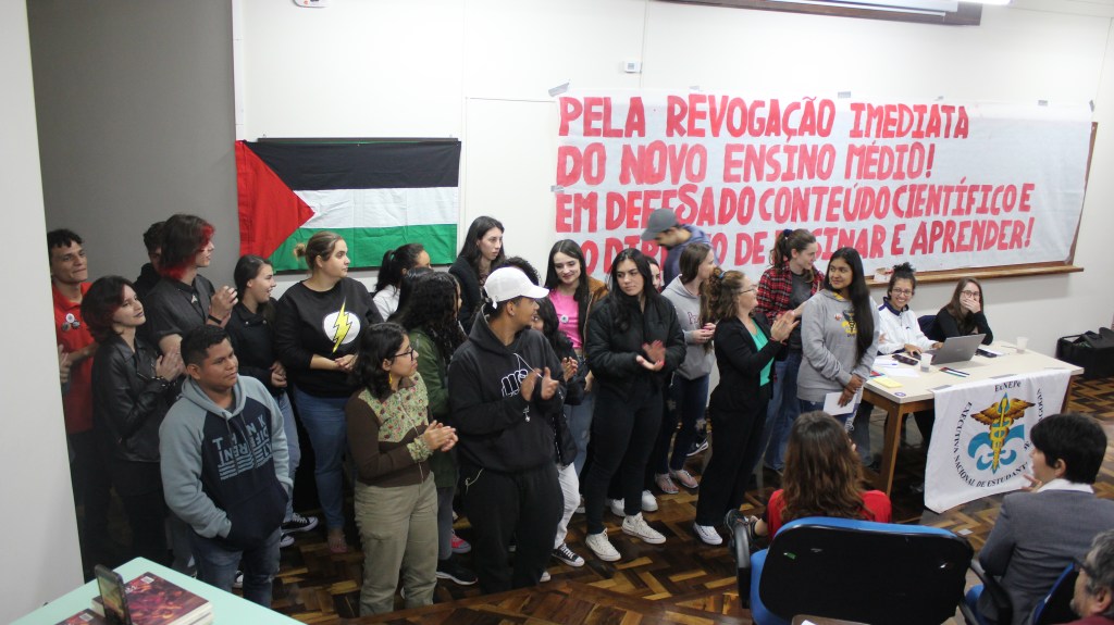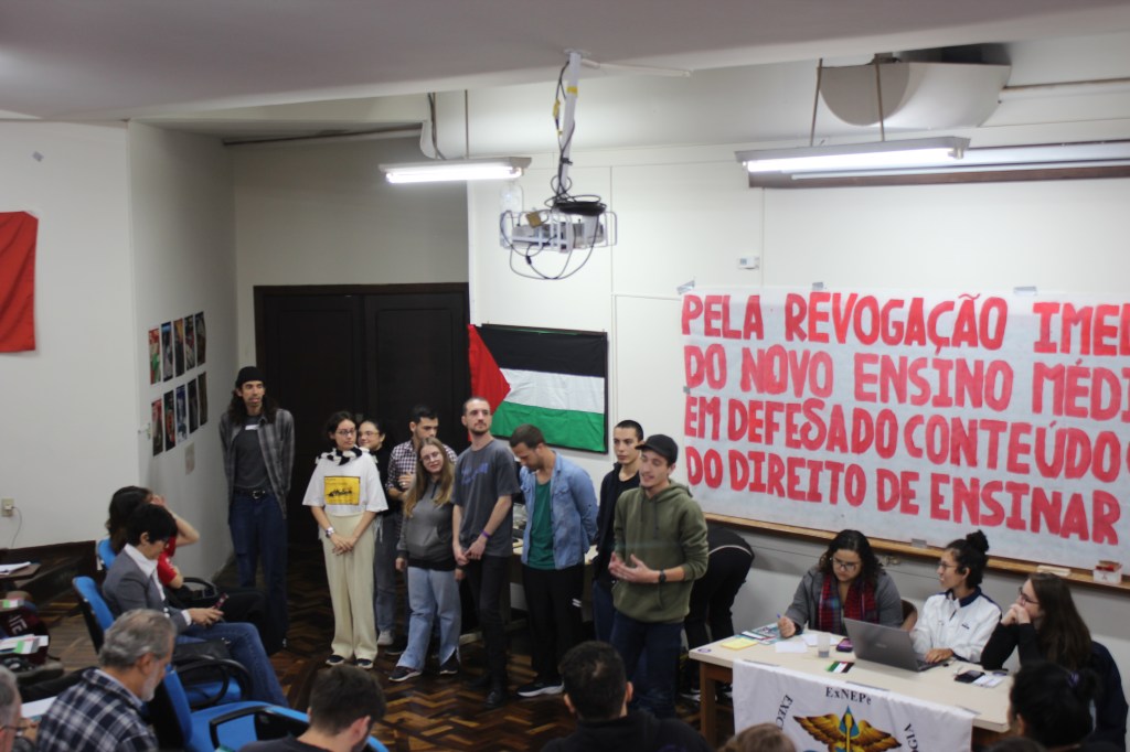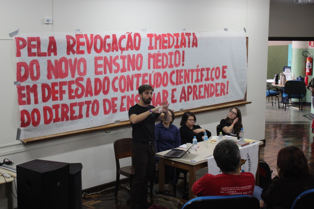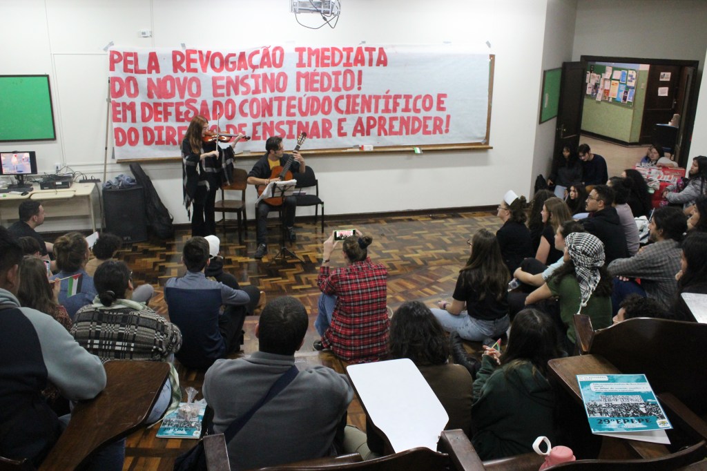 A mesa sobre o Novo Ensino Médio contou com a participação da Doutora Mônica Ribeiro – coordenadora do Observatório do Ensino Médio e a maior referência sobre o assunto no campo da educação, lutando há décadas contra a precarização do Ensino Público -, de uma estudante secundarista do local e do estudante de pedagogia Antônio Nogueira – presidente da Executiva Nacional de Estudantes de Pedagogia.
