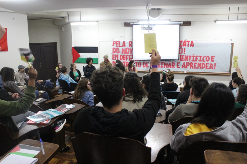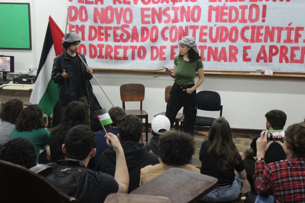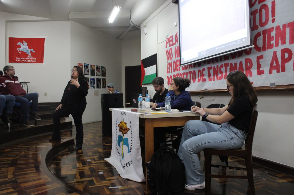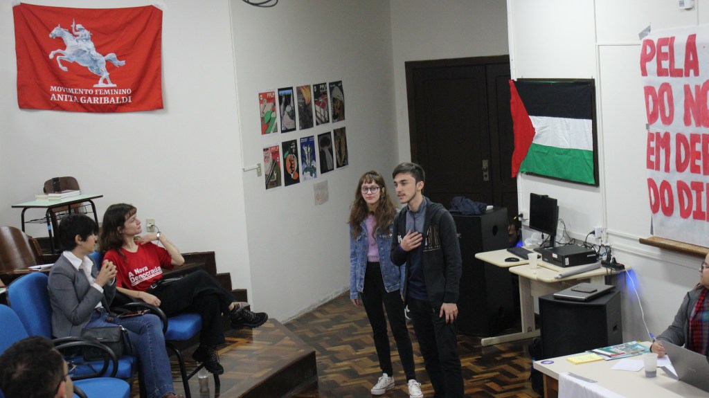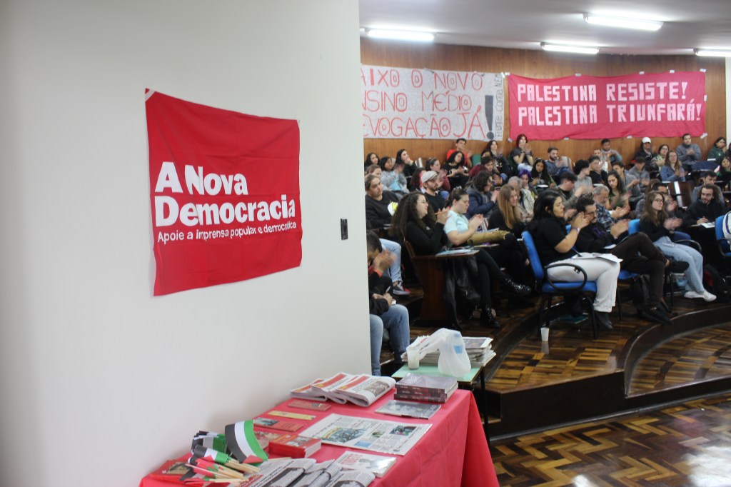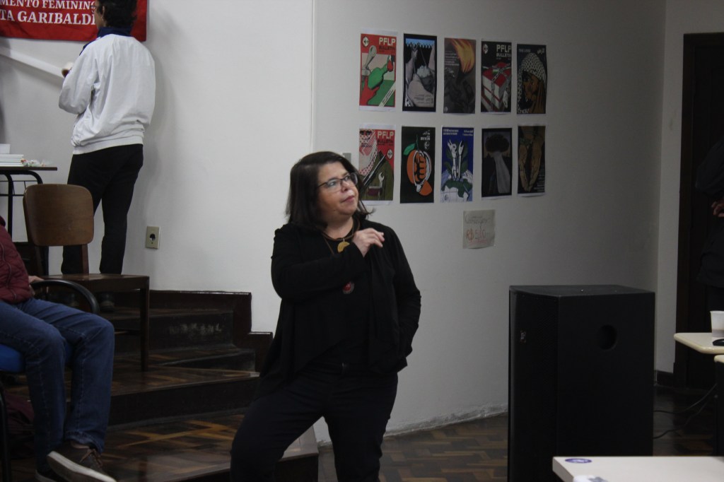 A mesa de situação política contou com a participação da jornalista e escritora Cassiana Pizaia – que possui uma variedade grande de livros infantis que retratam sobre a vida nos países do Oriente Médio, além da jornalista possuir muita experiência na luta por um jornalismo democrático e anti-imperialista no país- e também com a participação do Comitê de Apoio ao jornal A Nova Democracia. A jornalista trouxe um bom histórico sobre a Resistência Palestina e a agressão imperialista executada pelo Estado Sionista de Israel, contextualizando a situação política na região local, e trazendo sobre o papel do monopólio da mídia imperialista na perpetração da história falsa e na legitimação dos ataques imperialistas. Ressaltou também como o povo palestino vem se organizando da melhor forma para resistir e tem tido importante triunfos contra todo esse cerco.