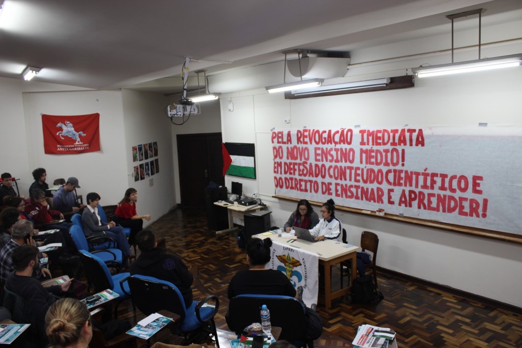 A professora Mônica Ribeiro trouxe todo o histórico da precarização do ensino médio no país, mostrando com dados e informações acerca das diferentes leis e propostas que circularam o país, transparecendo quais são os grupos privatistas que sempre estiveram por trás dessas propostas para a educação básica. A doutora esmiuçou muito bem cada detalhe do Novo Ensino Médio e desmistificou toda a propaganda enganosa por trás do mesmo, desmascarando toda a precarização e privatização do ensino que a proposta incorpora. A estudante secundarista relatou como o Novo Ensino Médio já tem individualizado e jogado nas costas de cada estudante todos os problemas que a sociedade abrange com a inserção do “empreendedorismo” nas escolas. Explicou muito bem como isso destrói a consciência coletiva e esvazia o caráter de classe nas relações sociais. O presidente da ExNEPe detalhou como o modelo de precarização de ensino trazido para o Brasil com o Novo Ensino Médio, já foi aplicado em alguns países e está sendo aplicado em todo o mundo, esclarecendo como isso faz parte de uma dominação principalmente ideológica dos povos, mas também política e econômica. Explicitou como o Banco Mundial está por trás de todas essas políticas e o quão importante é o papel das mobilizações estudantis na luta democrática pelos direitos mais básicos.