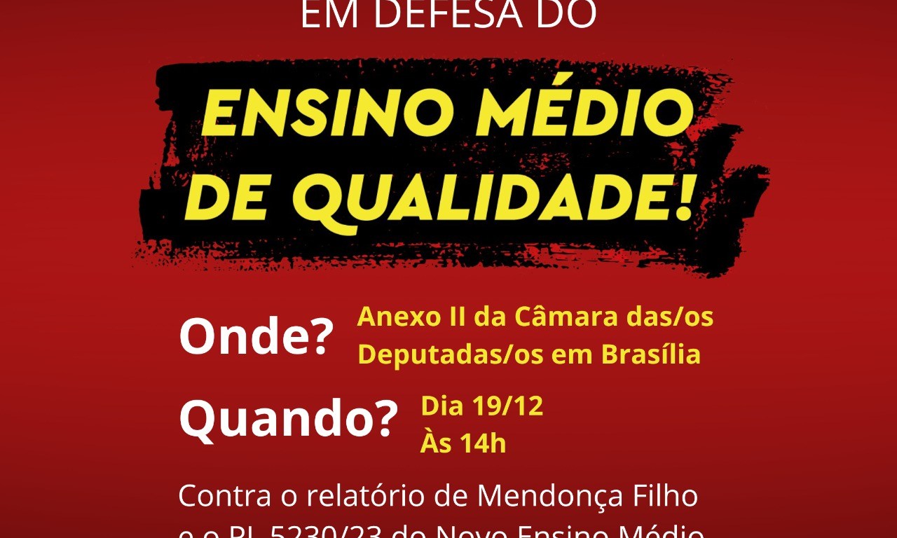 Repercutimos e nos somamos ao chamado do ANDES e demais entidades para a manifestação de 19 de dezembro em Brasília! No apagar das luzes de 2023 a Câmara dos Deputados vai votar em regime de urgência a farsesca reforma da reforma do Novo Ensino Médio, o PL 5.230/2023! Convocamos todos estudantes, professores e comunidade, defensores da educação, entidades democráticas, a se somarem nesta luta em defesa do ensino público e gratuito!
