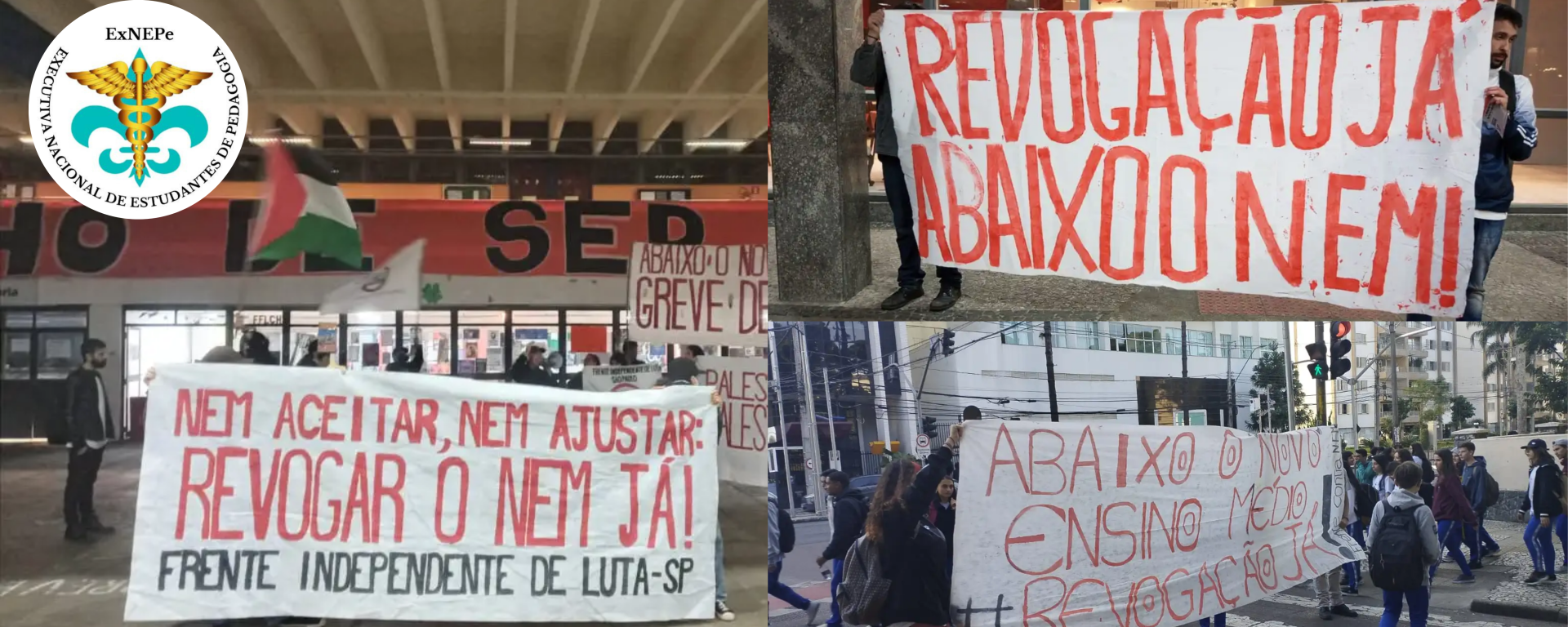 A Executiva Nacional de Estudantes de Pedagogia está desde o início da formulação do NEM se posicionando e denunciando este famigerado, reacionário e anticientífico projeto, que tem como único objetivo atacar o ensino público e gratuito. Convocamos todos os estudantes e docentes de escolas e universidades e todos os trabalhadores a se levantarem contra o NEM, sem fazer concessões ao governo oportunista. Sem ilusão com promessas vazias e pomposas. Convocamos todos, estudantes, professores e a comunidade a irem às ruas, realizar debates, organizar manifestações e intervenções em escolas e universidades. Unir-se à luta que já ocorre nas universidades federais de todo o país, politizando-a sobre a necessidade de revogar o NEM e aplicando a tática da greve de ocupação!