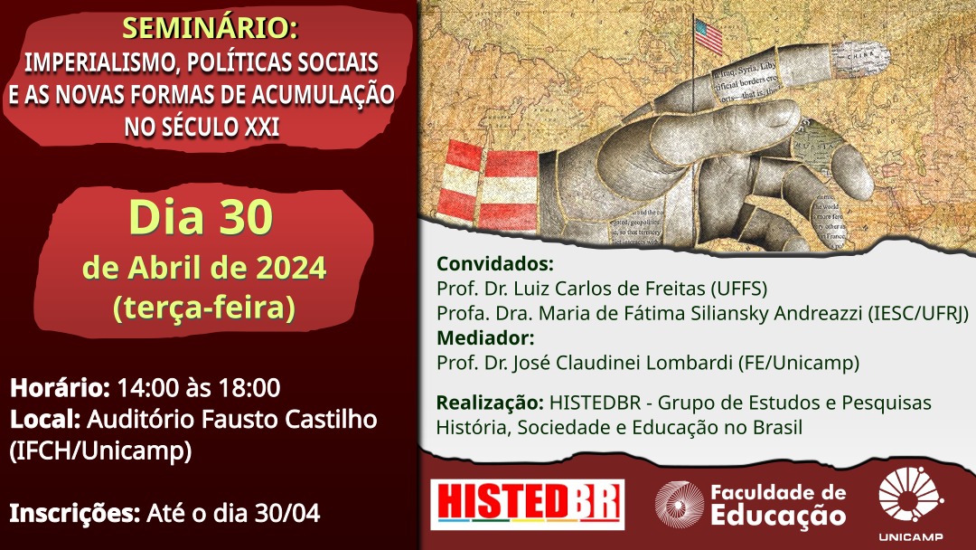 O HISTEDBR – Grupo de Estudos e Pesquisas História, Sociedade e Educação no Brasil, realizará importante seminário de formação. O tema será “IMPERIALISMO, POLÍTICAS SOCIAIS E AS NOVAS FORMAS DE ACUMULAÇÃO NO SÉCULO XXI”. O seminário irá ocorrer no dia 30 de abril das 14:00 as 18:00, no auditório Fausto Castilho, no IFCH/Unicamp.