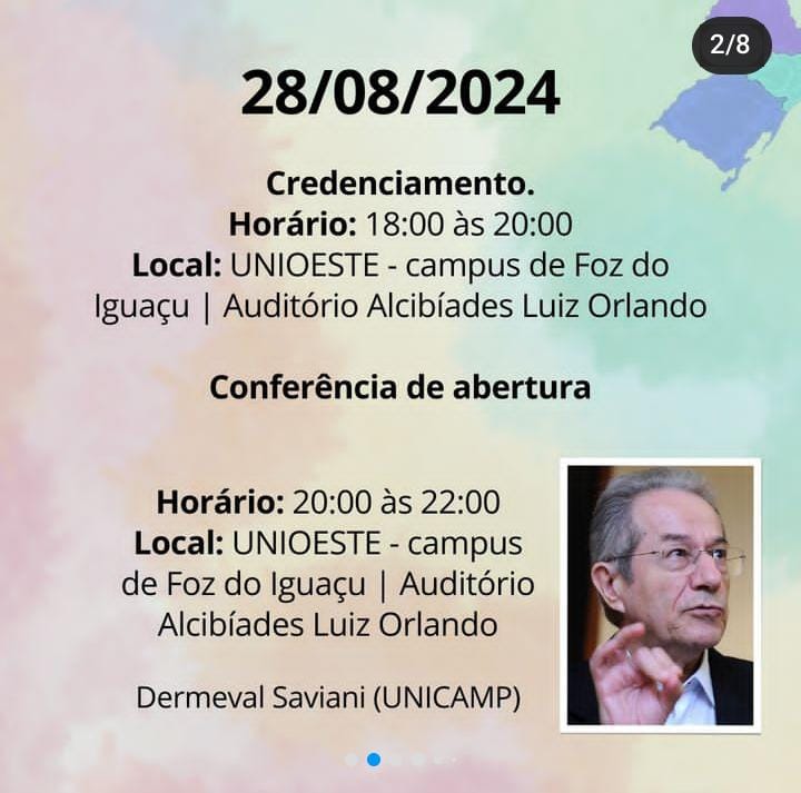 O evento que contará com a presença de Dermeval Saviani, dentre outros pesquisadores em educação, será realizado nos dias 28, 29 e 30 de agosto de 2024, na Universidade Estadual do Oeste do Paraná, campus de Foz do Iguaçu.