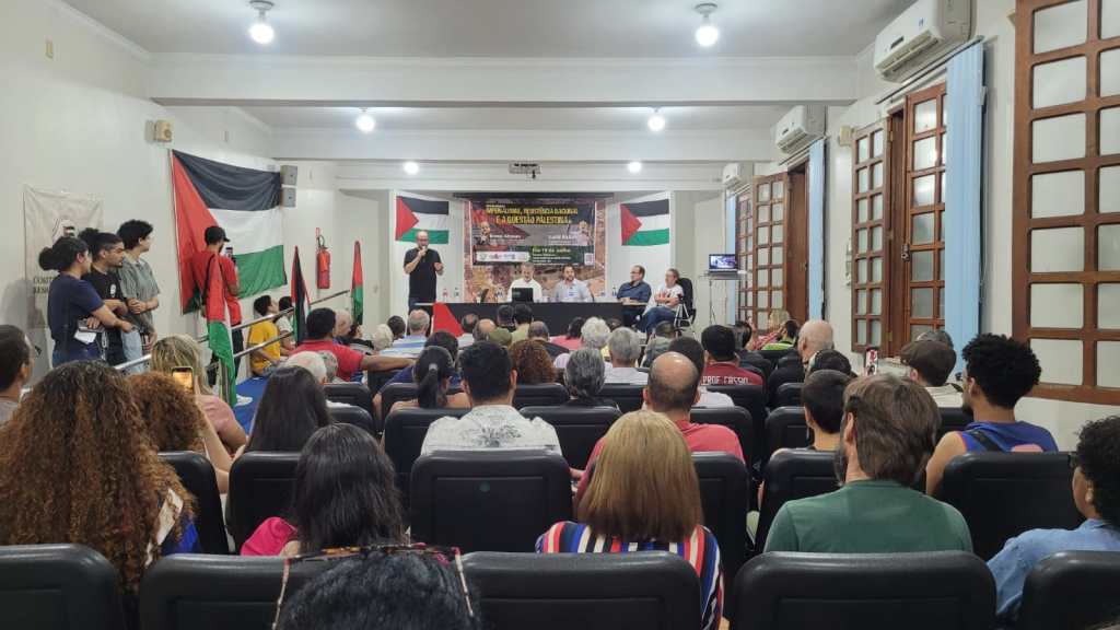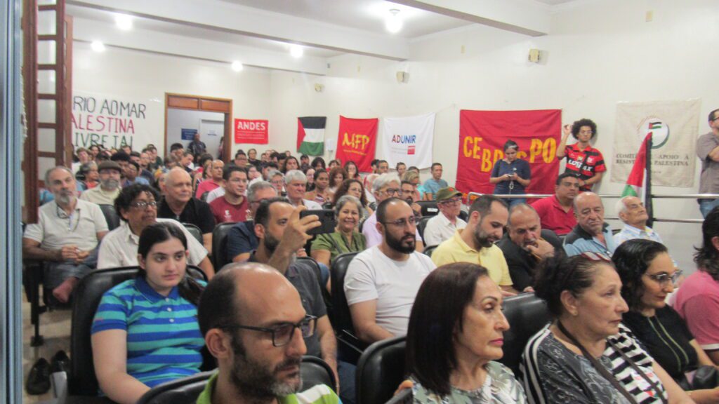 A semana de solidariedade ao povo palestino na UNIR, promovida pelos estudantes através do DCE e demais centros acadêmicos, teve início com a participação ativa dos estudantes no importante Seminário “Imperialismo, libertação nacional e a questão Palestina”, que reuniu centenas de pessoas no auditório da UNIR centro, no dia 18 de junho, e contou com as ilustres presenças de Ualid Rabah, presidente da FEPAL, e Breno Altman, jornalista fundador do portal Opera Mundi, que também realizou o lançamento de seu livro “Contra o sionismo: retrato de uma doutrina colonial e racista, com uma acalorada sessão de autógrafos, além da presença de representantes da comunidade árabe local. Os estudantes se engajaram na organização do evento, convocado pelo Comitê de Apoio à Resistência Palestina – Rondônia e demais entidades, tomando parte ativa no credenciamento dos participantes, ornamentação do espaço, segurança dos presentes, assim como contribuindo com o debate com uma pergunta para que os palestrantes comentassem a importância dos acampamentos estudantis ao redor do mundo, no que Ualid Rabah respondeu ser este um dos movimentos de solidariedade ao povo palestino mais importantes das últimas décadas.
