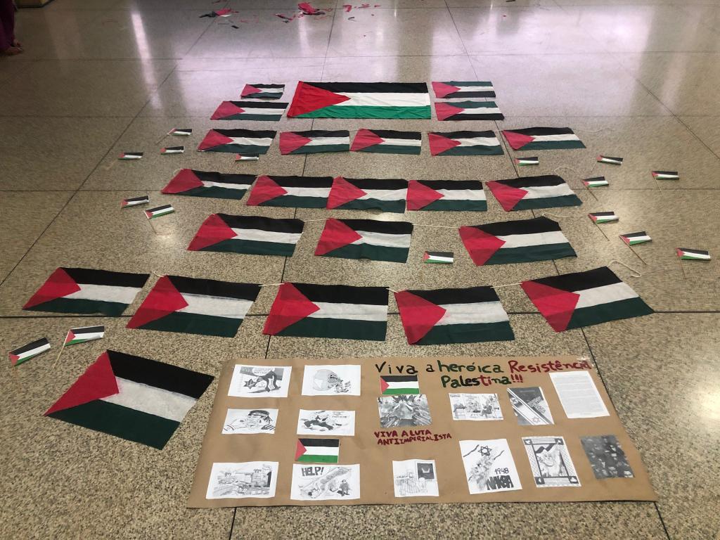 Já durante a sexta-feira, 21 de junho, os estudantes realizaram um vigoroso ato político-cultural no restaurante universitário e uma panfletagem. Segurando bandeiras da palestina e uma faixa com a consigna “Do rio ao mar, Palestina livre já!”, os estudantes realizaram uma vibrante agitação sobre a poesia palestina de combate, na qual dos escombros da guerra, surgem os mais combativos versos dos poetas combatentes, que com seus cantos exaltam e tomam parte na heroica resistência palestina. Já no período da tarde, para encerrar em altíssimo nível a importante semana, foi realizada uma altiva oficina de bandeiras e cartazes. Ao som de canções revolucionárias palestinas, dezenas de bandeiras palestinas, assim como um mural com charges em apoio ao povo palestino, foram produzidos com objetivo de decorar o espaço da UNIR com as cores da luta palestina.
