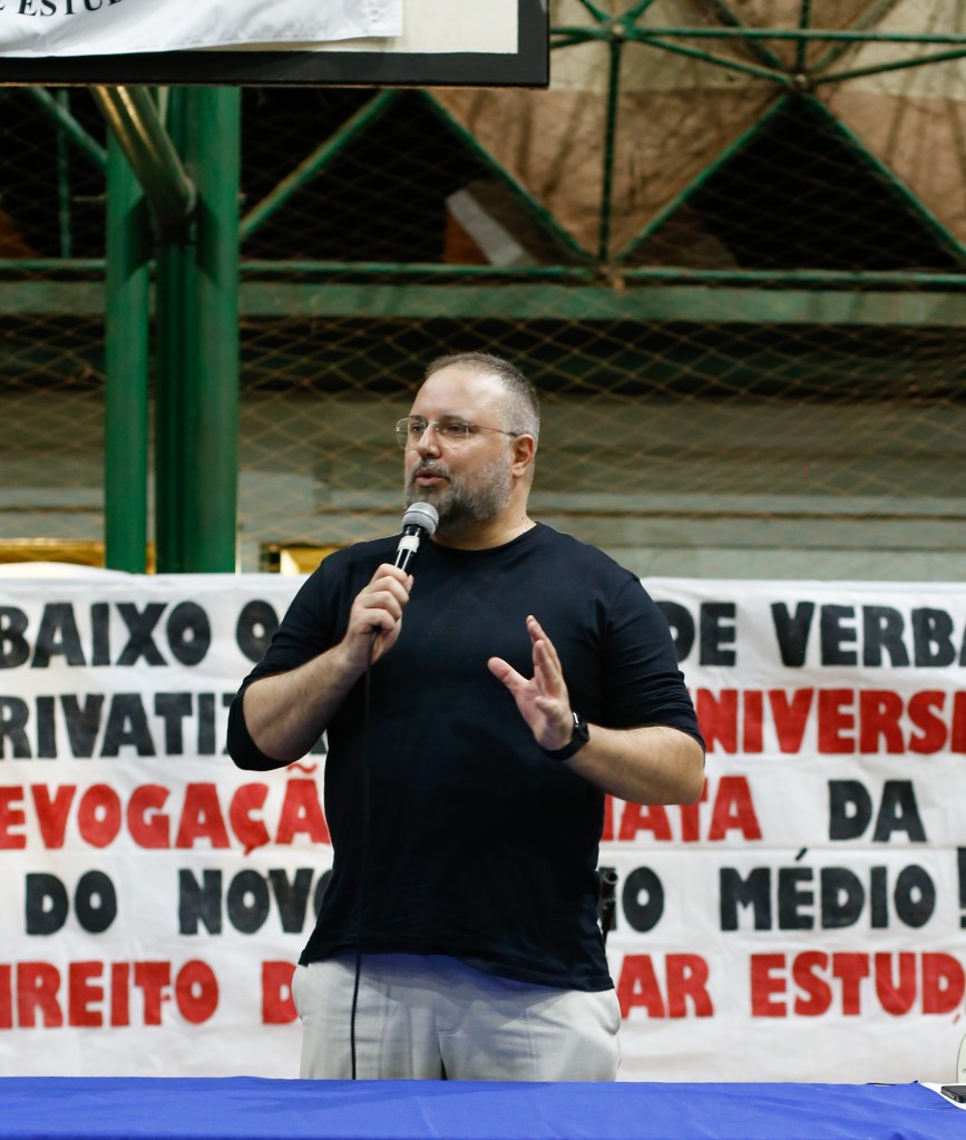 Na mesa “Pela Revogação Imediata do Novo Ensino Médio! Em Defesa do Direito de Ensinar e Aprender” tivemos como palestrantes o Professor Doutor da Universidade de São Paulo (USP) e membro do Comitê da Campanha Nacional pelo Direito à Educação Daniel Cara e o Professor Doutor da Universidade de São Paulo (USP) e membro da Rede Escola Pública e Universidade (REPU) e da Comitê da Campanha Nacional pelo Direito Fernando Cássio.