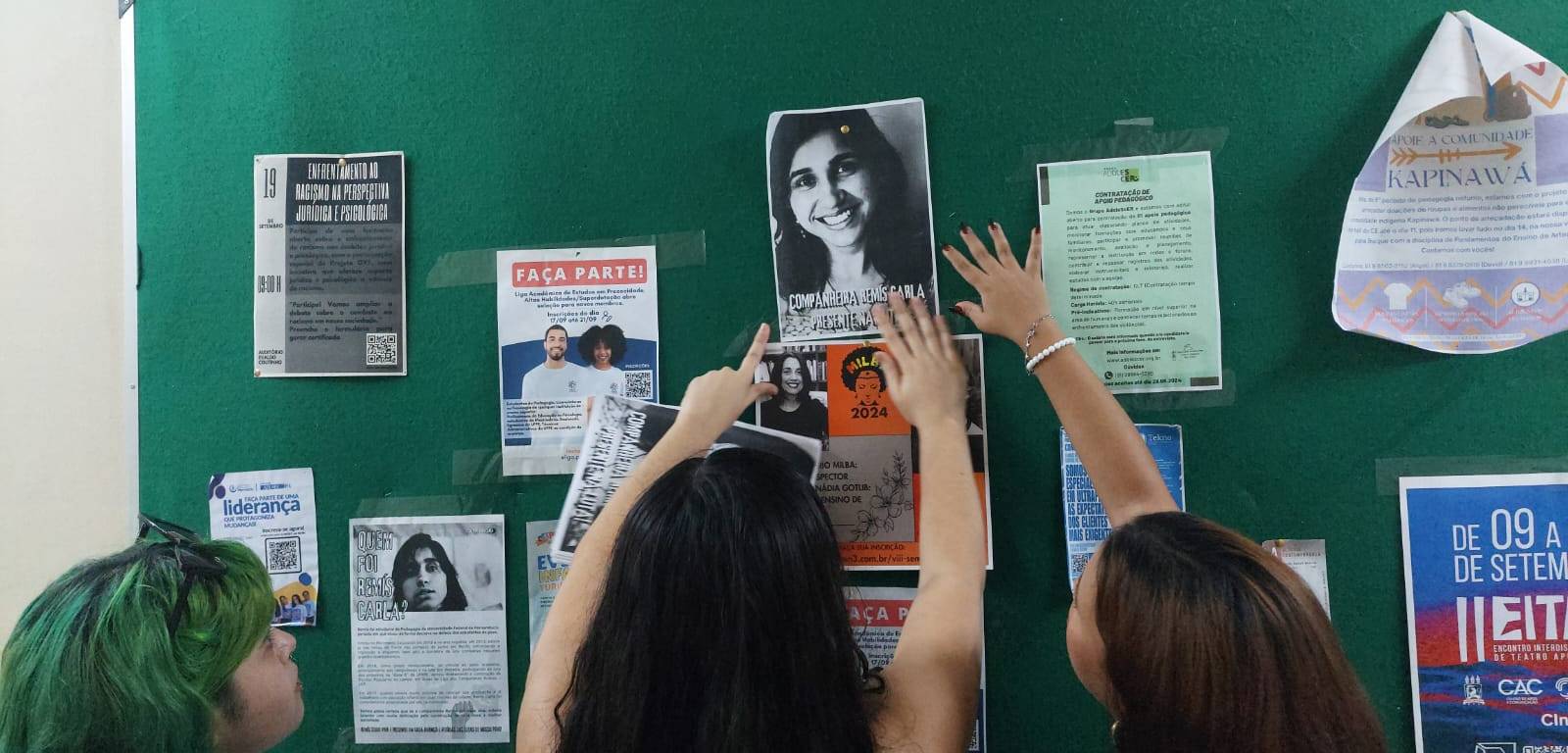 Estudantes de pedagogia da UFPE realizaram uma atividade de colagem de cartazes homenageando Remís Carla no Centro de Educação (CE), onde a militante estudou e atuou.