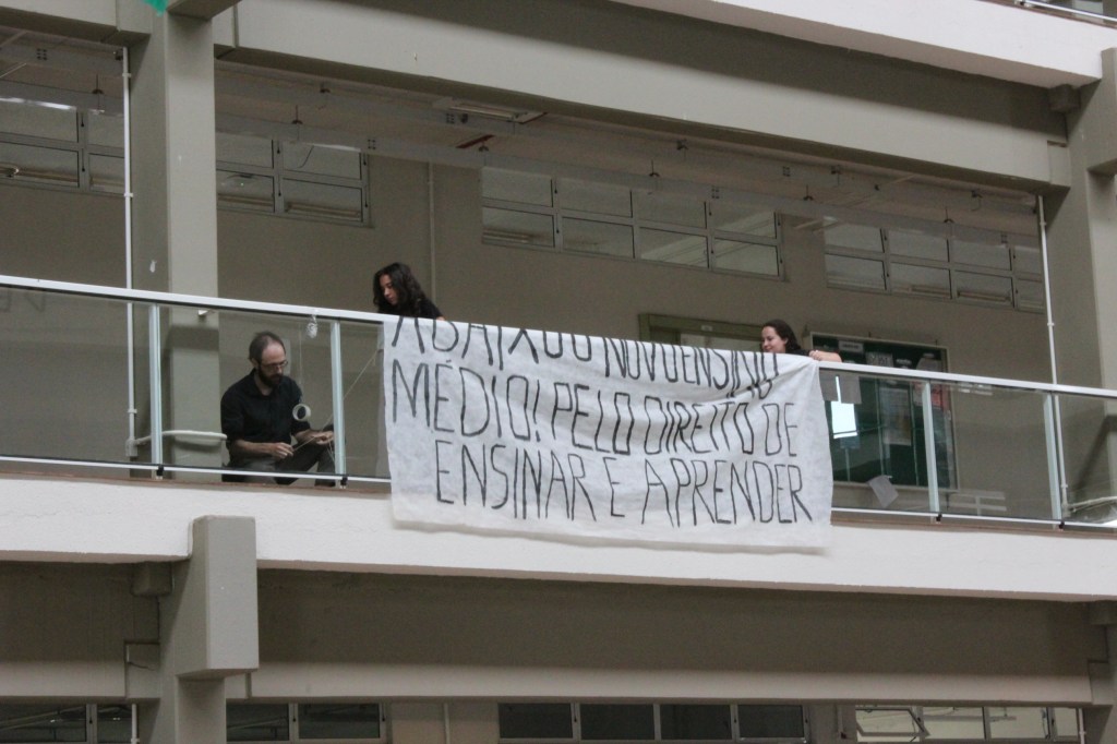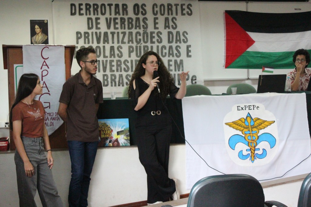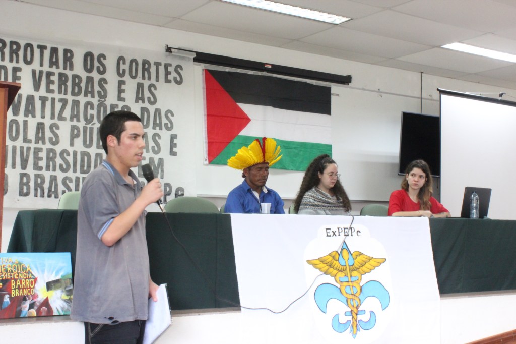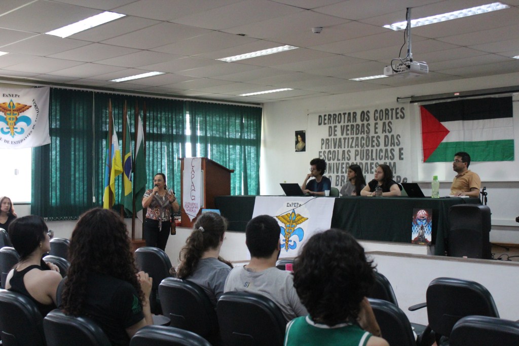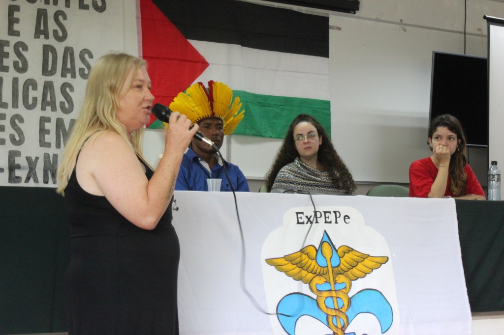 A mesa principal contou com a participação da presidente da Executiva Nacional de Estudantes de Pedagogia (ExNEPE) Ana Caroline, do profº Luiz Carlos de Freitas, e da secundarista Emanuela Pompeia Berion.