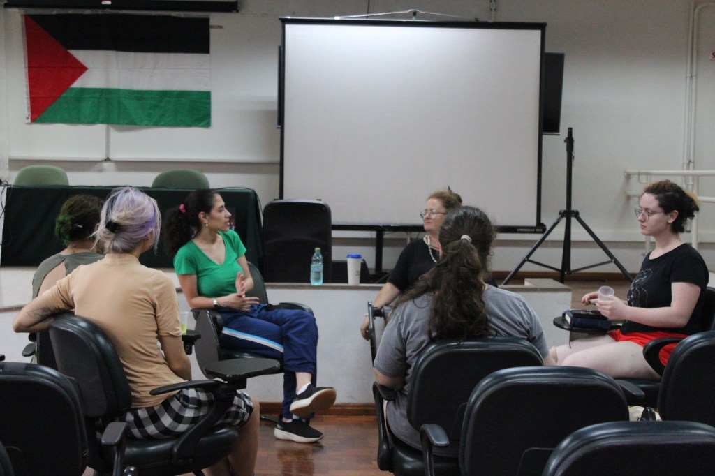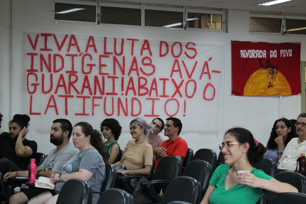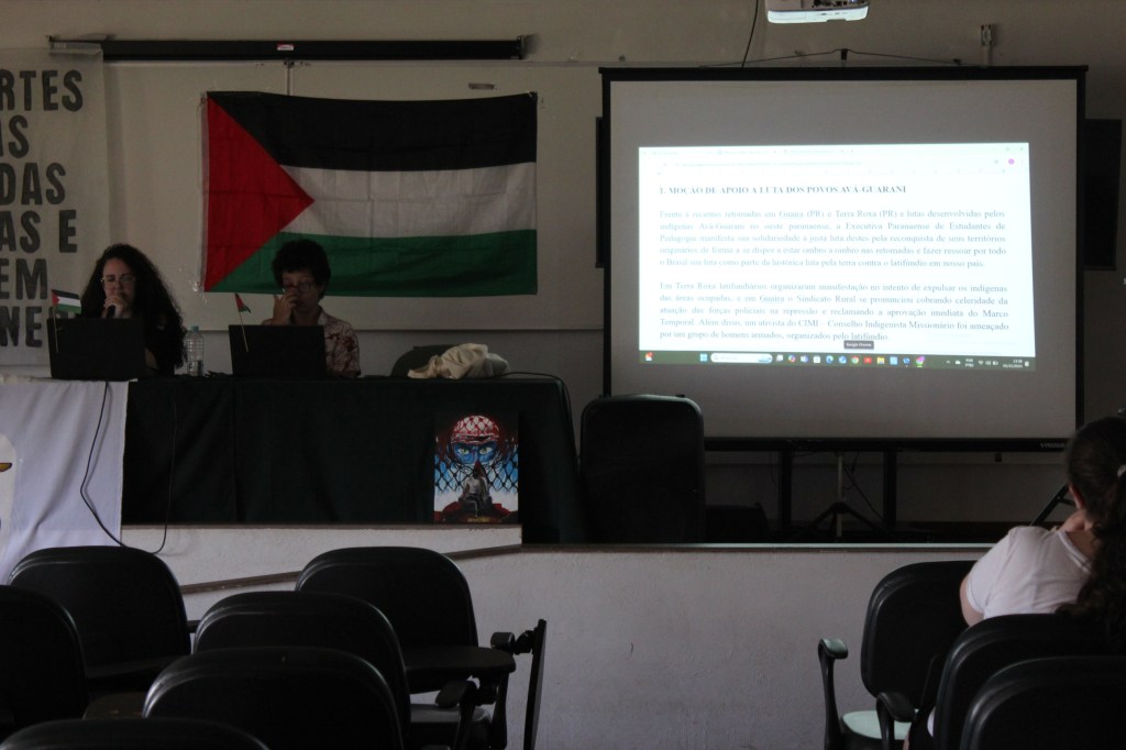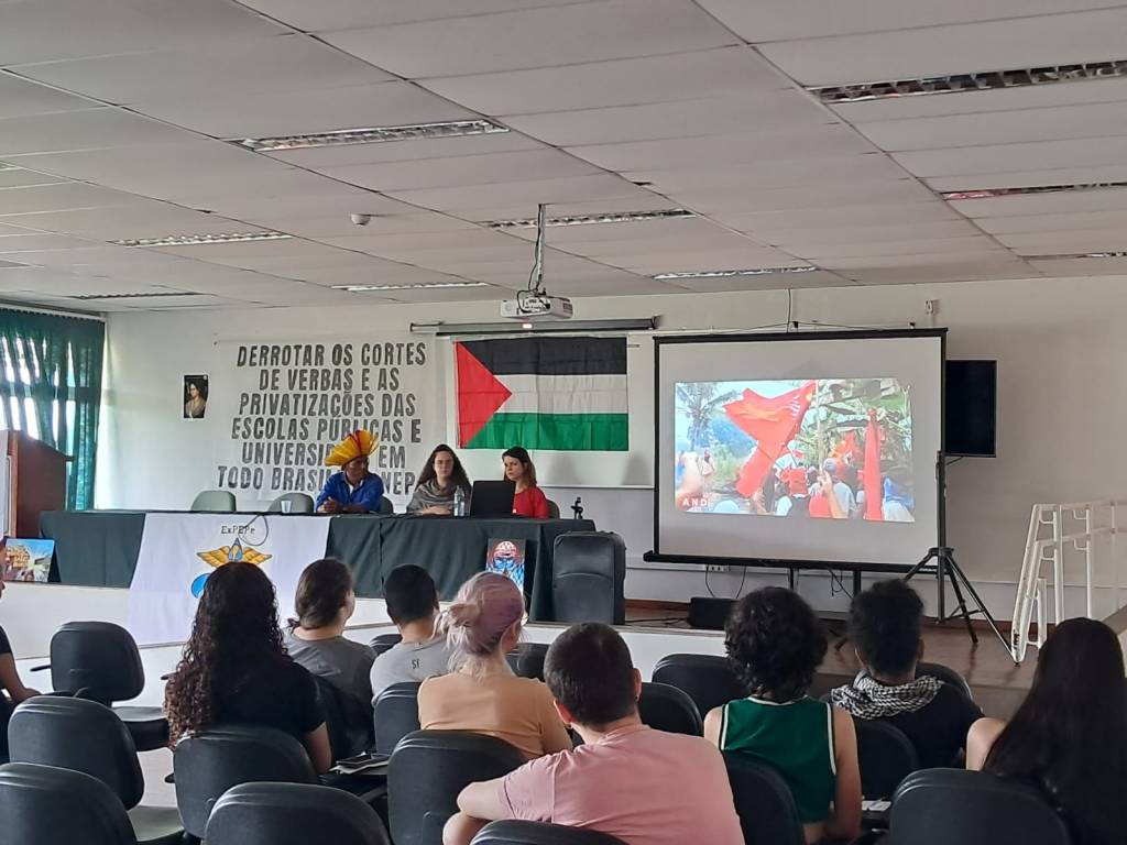 A representante do Comitê de Apoio ao Jornal A Nova Democracia fez uma exposição da situação política nacional, trazendo aspectos sobre o caráter reacionário das Forças Armadas Brasileiras, os avanços da perseguição e medidas repressivas adotadas pelo governo brasileiro as manifestações no campo e na cidade. Também ressaltou a Resistência Palestina como um duro golpe ao imperialismo norte-americano e o sionismo. Demarcou que os povos camponeses em luta pela terra são os palestinos do nosso país, reforçando que a luta pela terra hoje é a luta antifascista contra as investidas da repressão, especialmente através do grupo “Invasão Zero” como ocorreu em Barro Branco e outras lutas recentes. As intervenções e questionamentos que seguiram reforçaram a necessidade de romper os muros da universidade e colocaram a luta pela terra como o centro de toda luta democrática nacional. Por fim, foi exibida uma reportagem especial do jornal A Nova Democracia sobre a heroica Batalha de Barro Branco.