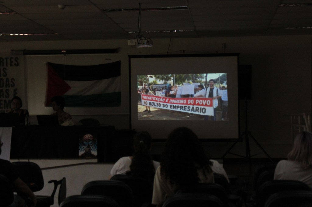 O professor Luiz iniciou a mesa trazendo uma contextualização da luta de classes, do surgimento da propriedade privada e as teorias que surgiram para explicá-la, desde a teoria liberal a teoria socialista desenvolvida pelo Marx e Engels, sendo a concepção materialista dialética a mais avançada que propõe a transformá-la. Falou de experiências como a Comuna de Paris, o avanço da luta em defesa dos direitos que surgem com a sociedade divida em classes que seguem a lógica “enquanto houver dominação, haverá resistência!” e a traição do movimento neoliberal e pós-moderno que reduziram essas lutas para revindicações identitárias, abandonando a bandeira da revolução social e o fim da propriedade privada. Por fim, o professor reforçou sobre os ataques privatistas como imposição do imperialismo através de organismos internacionais como o Banco Mundial.