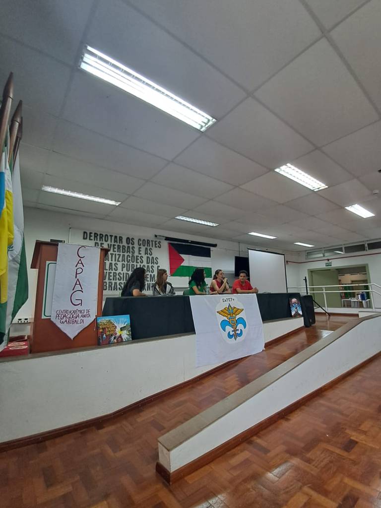 A mesa teve a participação do profº Gracialino da Silva Dias (Trabalhador brasileiro, professor doutor da UFFS – Laranjeiras do Sul), profª Maria Carolina Lobo (Professora pedagoga da rede estadual de ensino do Paraná, especialista em gestão escolar e direito educacional) e profª Rozenilda Luz Oliveira de Matos (Professora doutora da UEM).