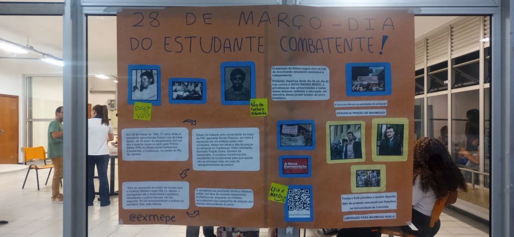 Estendido no hall da Faculdade de Educação, o mural trouxe a memoria de Edson e a denuncia e apoio ao Mahmoud Khalil, estudante que esteve a frente das greves de ocupação na universidade de columbia em apoio a resistência nacional palestina. Levantando o animo e vigor na faculdade que impulsiona a definição da pedagogia como um curso de luta!