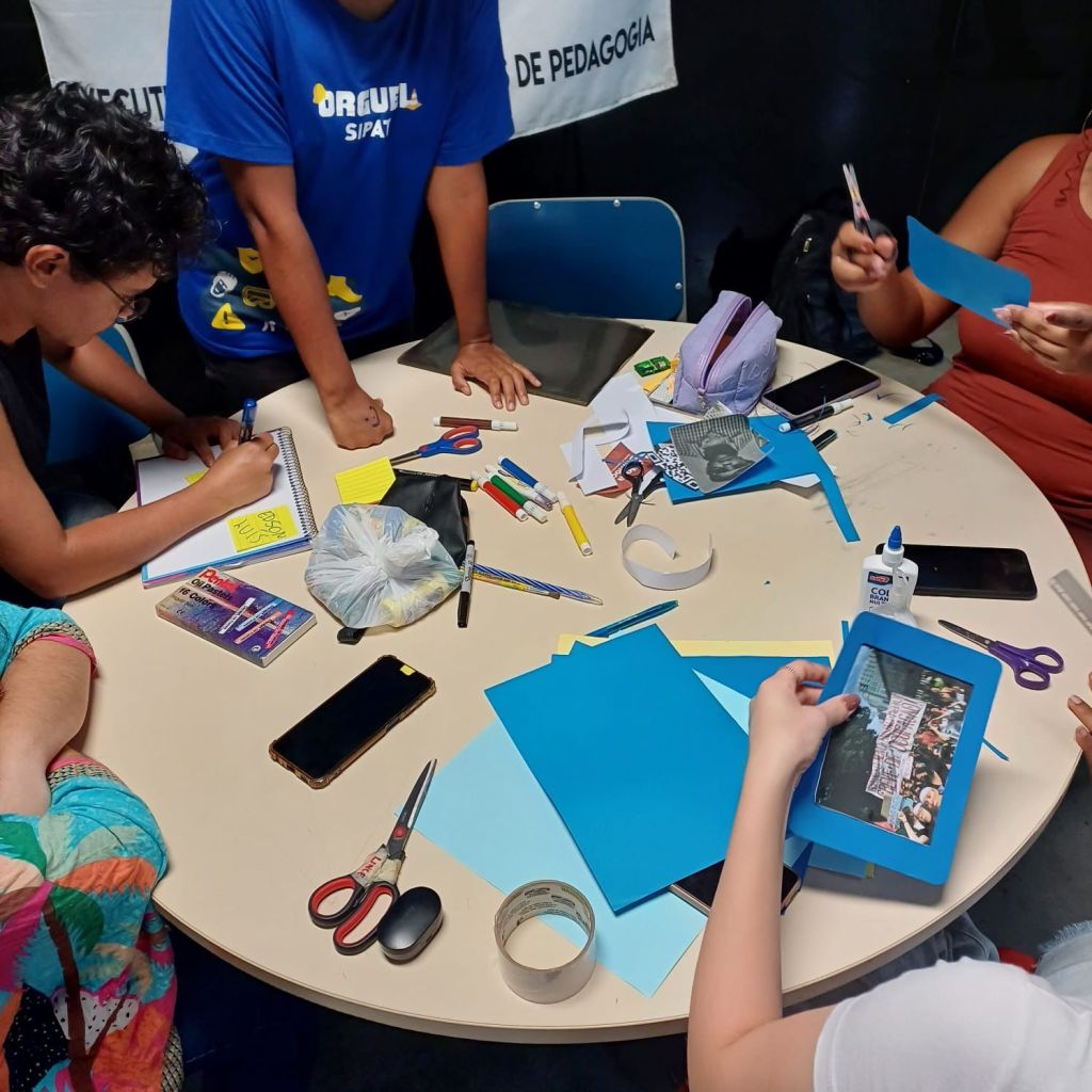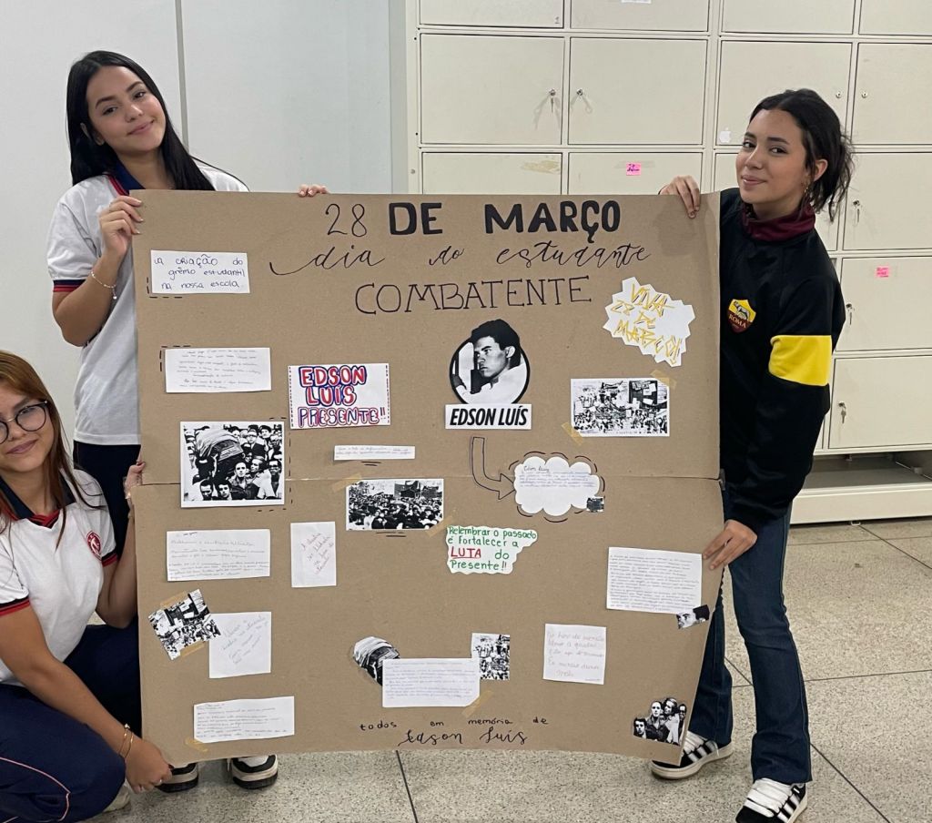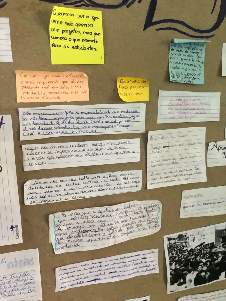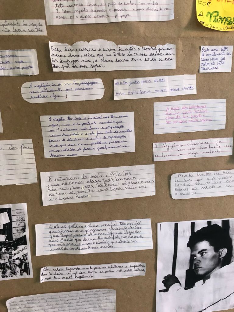 Sendo assim, foi confeccionado um mural com imagens e textos escritos à mão pelos alunos sobre a história do Dia do Estudante Combatente. Ao todo, 14 alunos contribuíram, seja cortando imagens, seja escrevendo as reivindicações sobre o que precisa melhorar na escola. Também destacaram a necessidade de reativar o grêmio estudantil, que está inativo desde a pandemia. Todos saíram animados e cheios de ideias sobre como avançar com a organização coletiva, independente e combativa dentro e fora da escola.