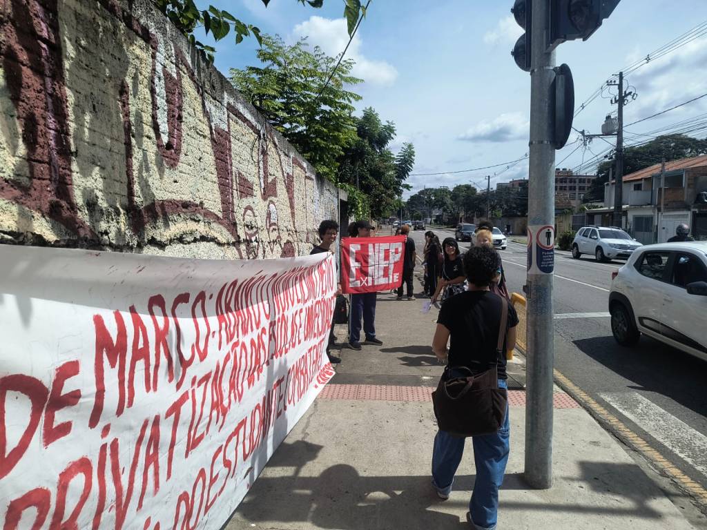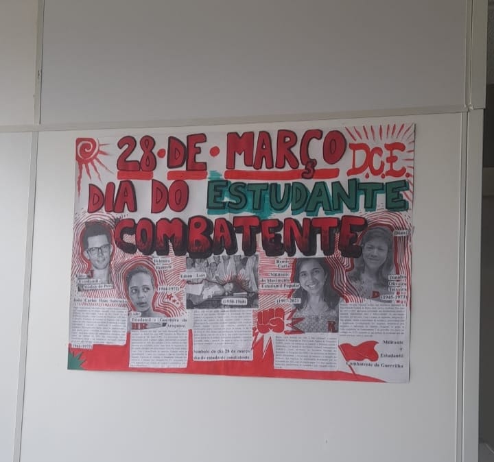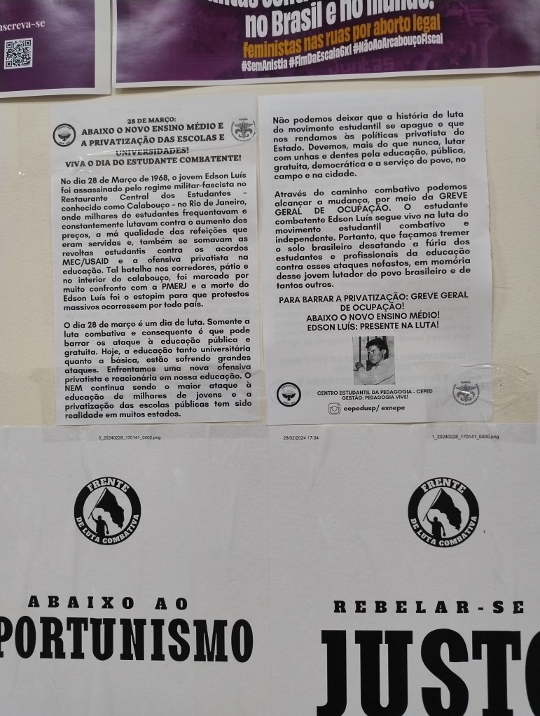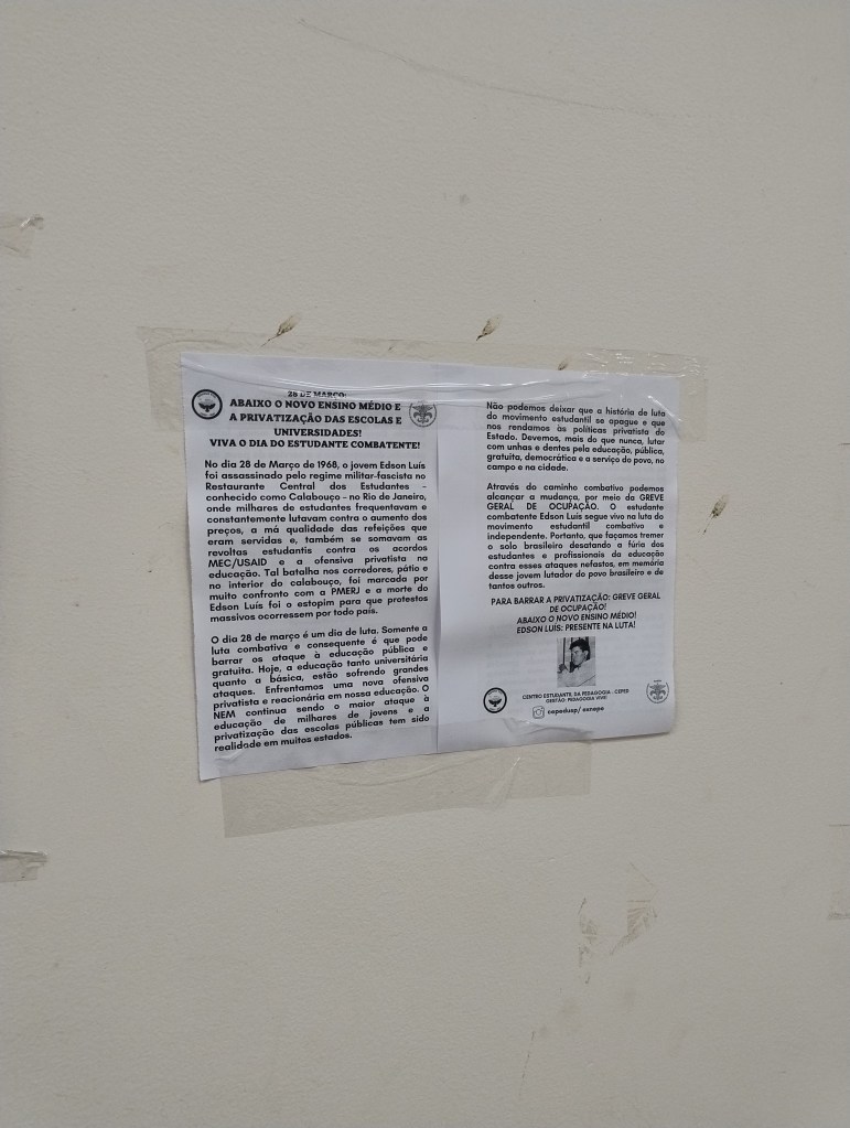 No dia 28 de março, o CEPed fez uma passagem nas salas do curso de pedagogia entregando panfletos sobre a data ressaltando a importância no exemplo de Edson Luís para o movimento estudantil combativo. Foi colocado aos estudantes sobre o contexto da época de seu assassinato e suas bandeiras de luta contra o MEC/USAID, as lutas que hoje a juventude emprega contra o Novo Ensino Médio, BNCC, escola cívico militar, parceiro da escola no Paraná, entre outros. Foi reforçado sobre o caminho da luta combativa como o único capaz de mudar a situação relembrando as recentes e combativas mobilizações feitas no estado em especial a ocupação do bloco 16 na USP em 2022 que teve participação destacada do curso de pedagogia e a ocupação em 2023 da prefeitura do Campus, ambas denunciaram a falta de docentes e reivindicou mais contratações de professores além que houvesse o pagamento dos salários dos servidores, fora outras reivindicações a nível estrutural da universidade. Destas ocupações foi conformado um GT (Grupo de Trabalho) que está vigente até hoje e consta a participação discente nas reuniões quinzenais para encaminhar alterações e medidas na estrutura do Campus. Foram feitas ao final das panfletagens colagem de panfletos por todo o bloco 16 para demarcar a importância do dia 28 de Março. – Dia do Estudante Combatente.