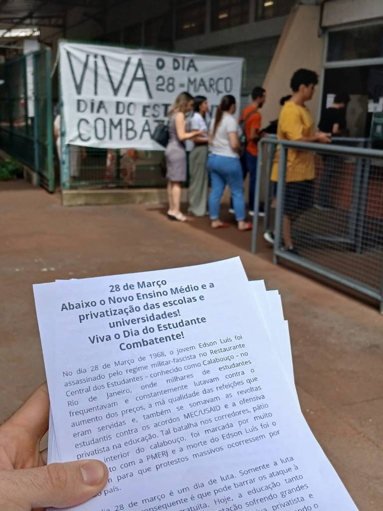 Além disso, foi feita uma passagem nas salas dos terceiros anos para falar sobre a importância da data e da luta contra a privatização das escolas e universidades, assim como a necessidade da revogação imediata do Novo Ensino Médio. Houve diversos relatos de insatisfação com as aulas de itinerários formativos e de projetos de vida, que, no fim, apenas serviram para reduzir ainda mais a quantidade de aulas de conteúdos essenciais. Além disso, em vez de solucionar, agravaram os problemas estruturais da escola.