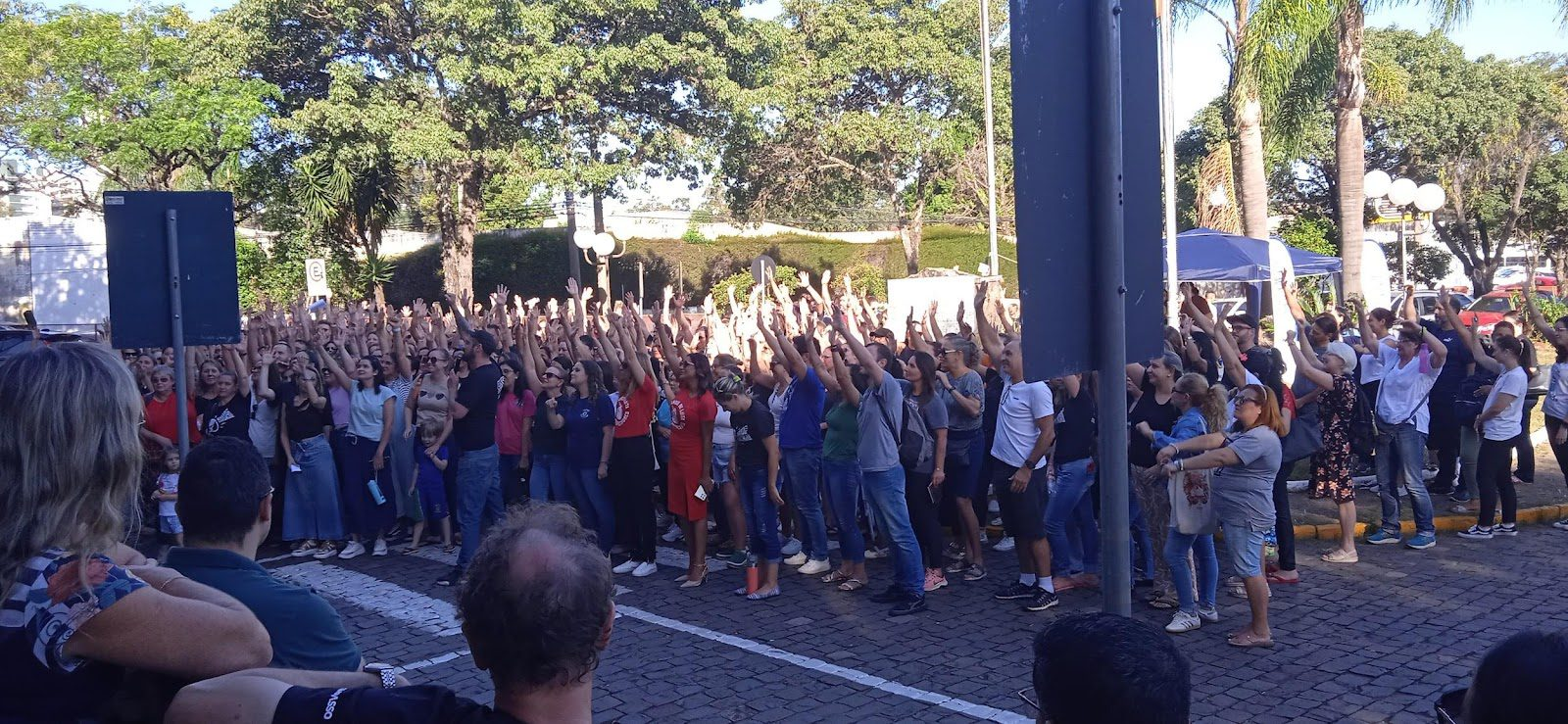 Professores reunidos em frente à prefeitura com faixas estendidas do CMP Sindicato e SIMPASSO. Foto: Banco de dados AND.