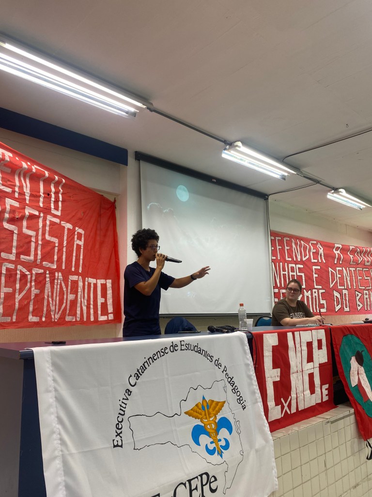 Foi destacada também a importante luta contra a falsa regulamentação da profissão de pedagogo, em 2017, e as recentes lutas contra o Novo Ensino Médio, a BNCC, a BNC de Formação de Professores, os cortes de verbas e o avanço da privatização. Em todos esses embates, a ExNEPe realizou mobilizações de norte a sul do país e esteve à frente na defesa e aplicação da greve de ocupação como tática do movimento estudantil para defender e conquistar seus direitos. Ao final da fala, todos foram convidados a participar do 26º FONEPe que ocorrerá no Pará e a construir a Executiva Estadual de Santa Catarina.