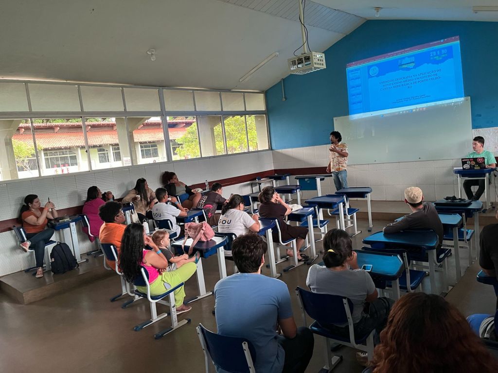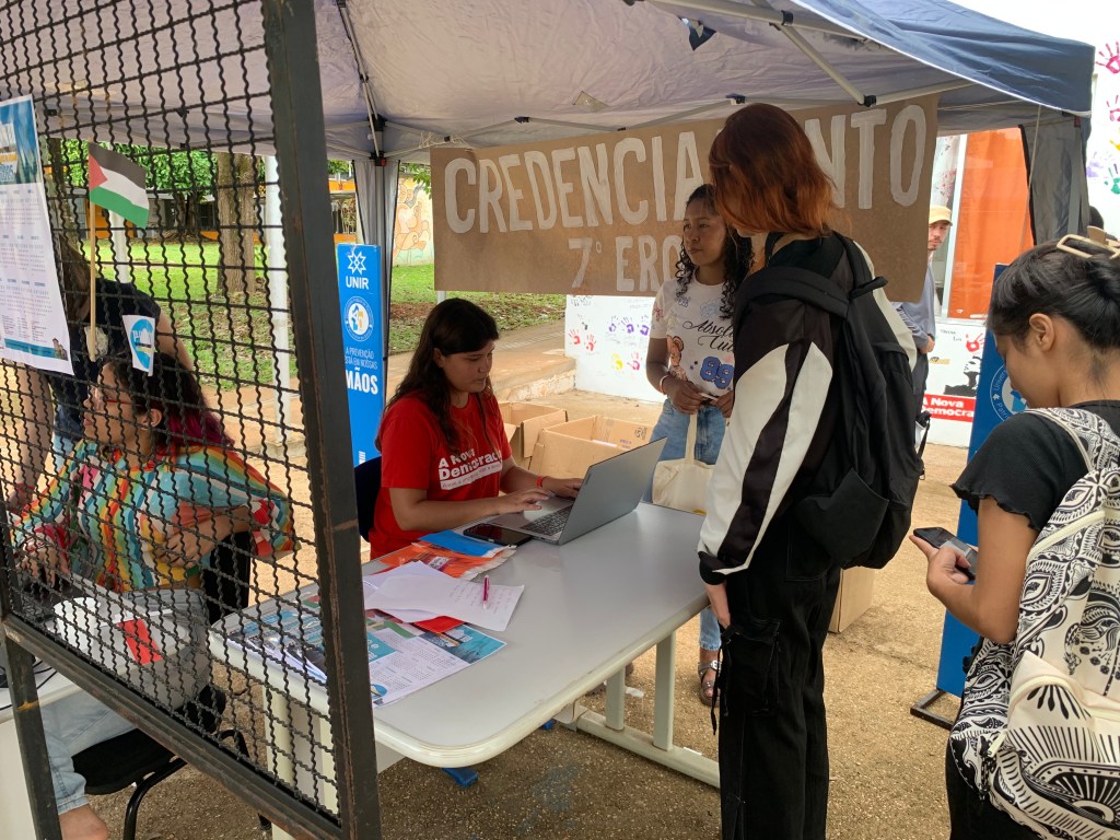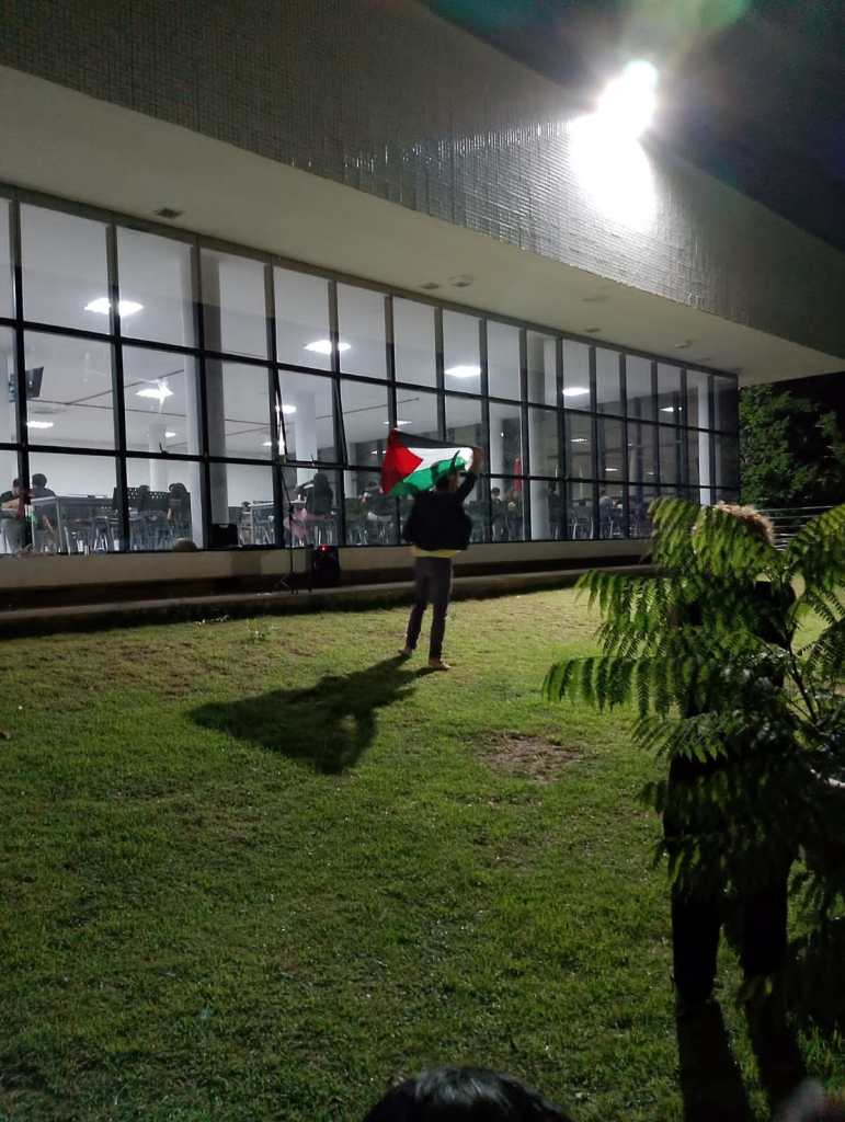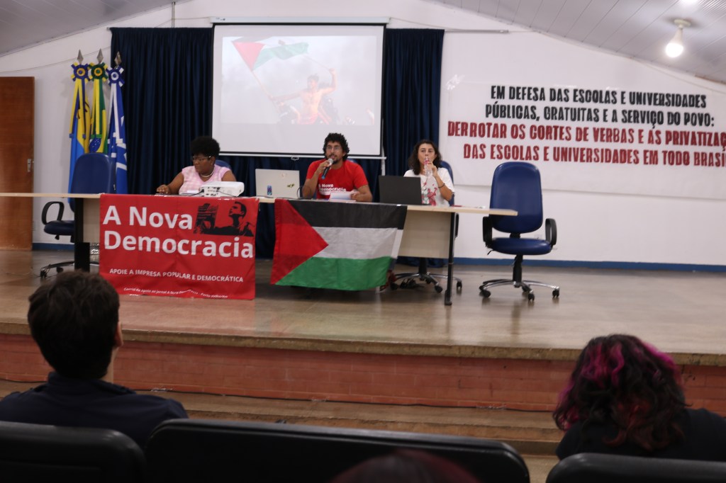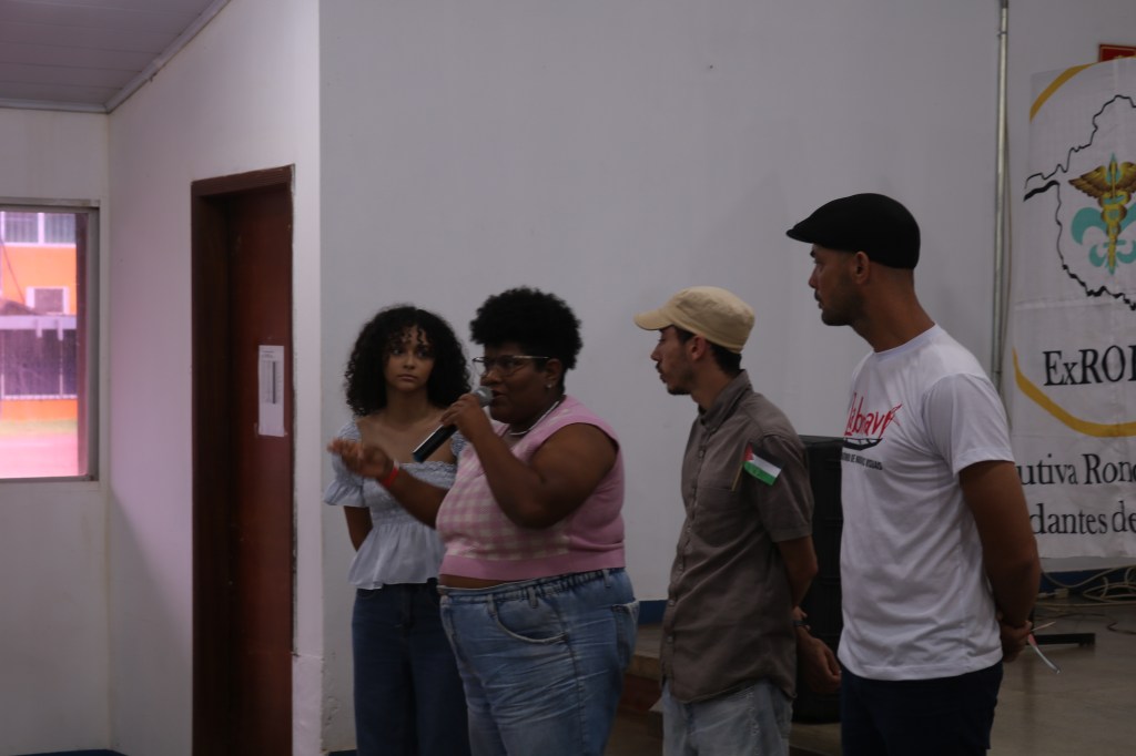 No dia seguinte, 6 estudantes secundaristas vieram para a universidade participar do evento. Iniciamos o dia com a mesa de situação política com um representante do Comitê de Apoio do jornal A Nova Democracia e a Nathalia Accioly, ativista do movimento Bem Viver. Eles trouxeram o histórico de luta da Palestina, bem como a heroica resistência do povo palestino. Foi tratado também sobre o contexto de luta pela terra, em especial, com relação a área Gedeon José Duque, localizada no município de Machadinho d’Oeste, onde recentemente sofreu ataques da pistolagem e da própria PM do estado. A situação foi denunciada e os estudantes demonstraram sua indignação perante o caso, demonstrado sua solidariedade nas falas e palavras de ordem.